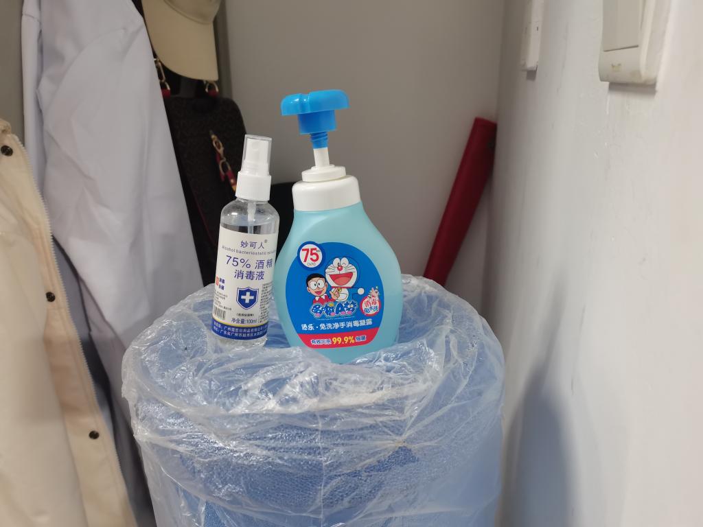 回到宿舍,穿过有淡淡消毒水味的楼道,公寓管理服务中心的阿姨每天都要背上重达几十斤的消毒喷雾器或手持消毒喷壶,辛勤地进行消毒消杀工作。随着大家对于防疫的重视程度越来越高,酒精喷雾和免洗洗手液也成了李梦宜所在宿舍的常备物资。