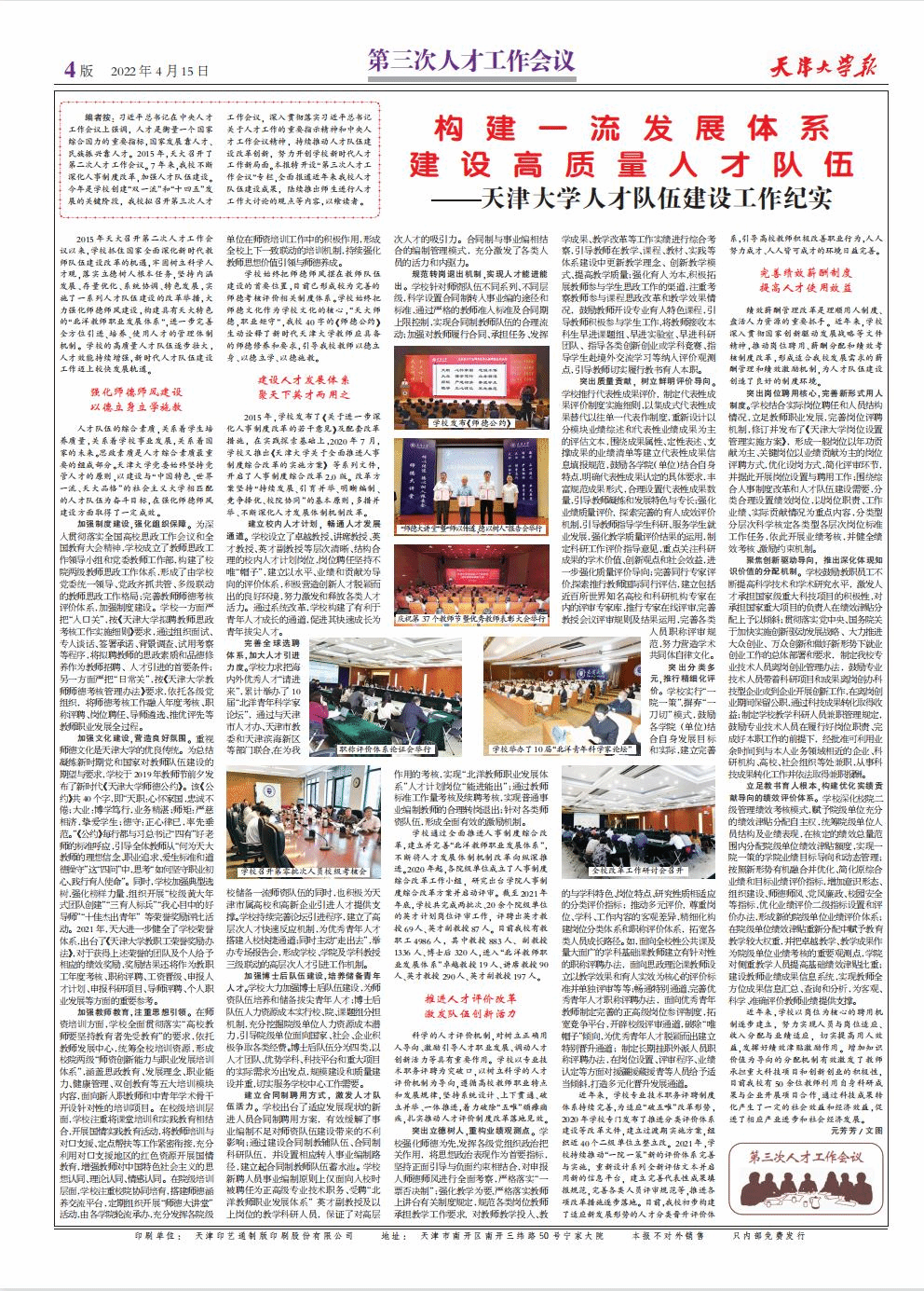 习近平总书记在中央人才工作会议上强调,人才是衡量一个国家综合国力的重要指标,国家发展靠人才、民族振兴靠人才。2015年,天大召开了第二次人才工作会议。7年来,我校不断深化人事制度改革,加强人才队伍建设。今年是学校创建“双一流”和“十四五”发展的关键阶段,我校拟召开第三次人才工作会议,深入贯彻落实习近平总书记关于人才工作的重要指示精神和中央人才工作会议精神,持续推动人才队伍建设改革创新,努力开创学校新时代人才工作新局面。本报特开设“第三次人才工作会议”专栏,全面报道近年来我校人才队伍建设成果,陆续推出师生进行人才工作大讨论的观点等内容,以飨读者。