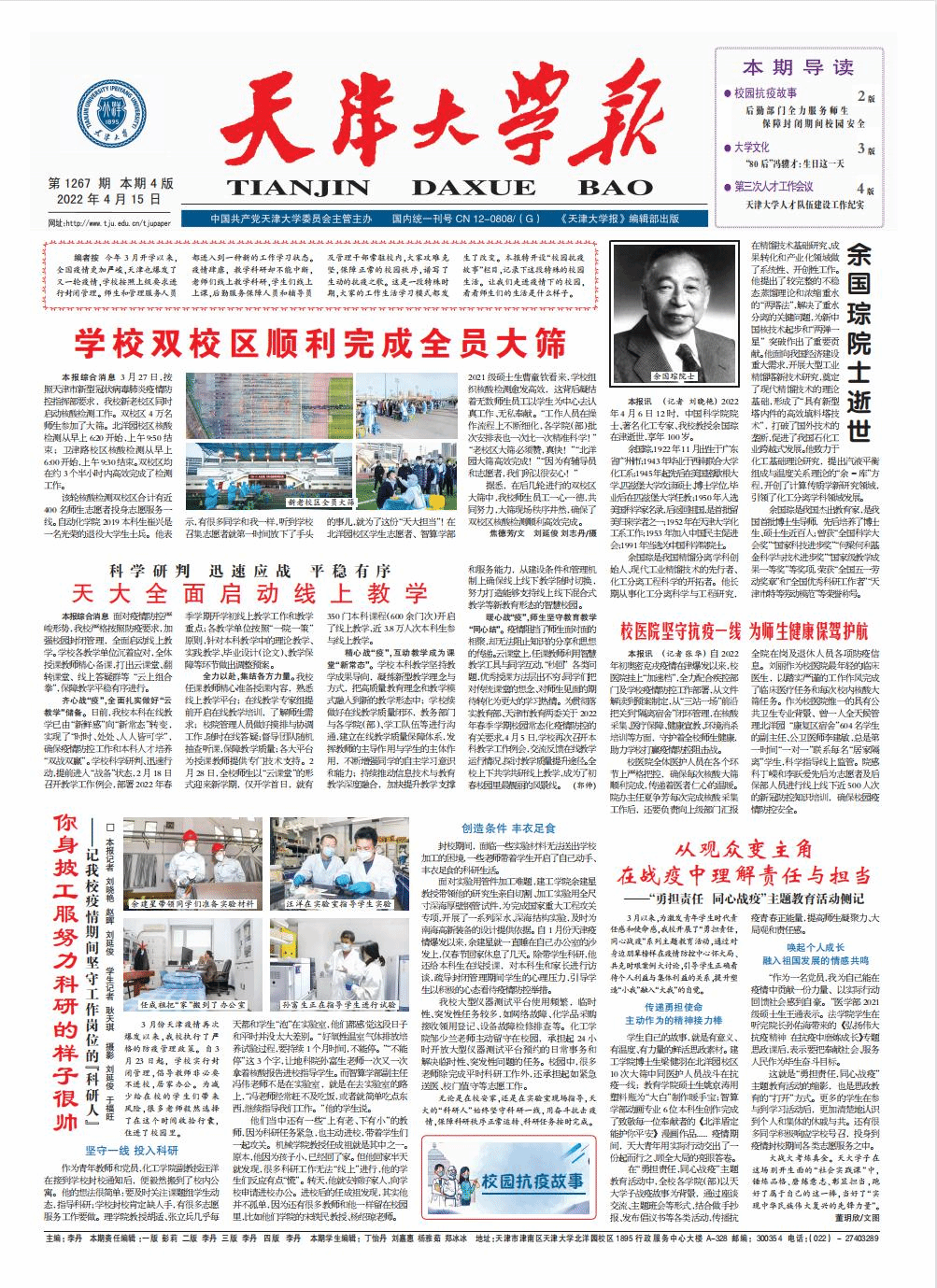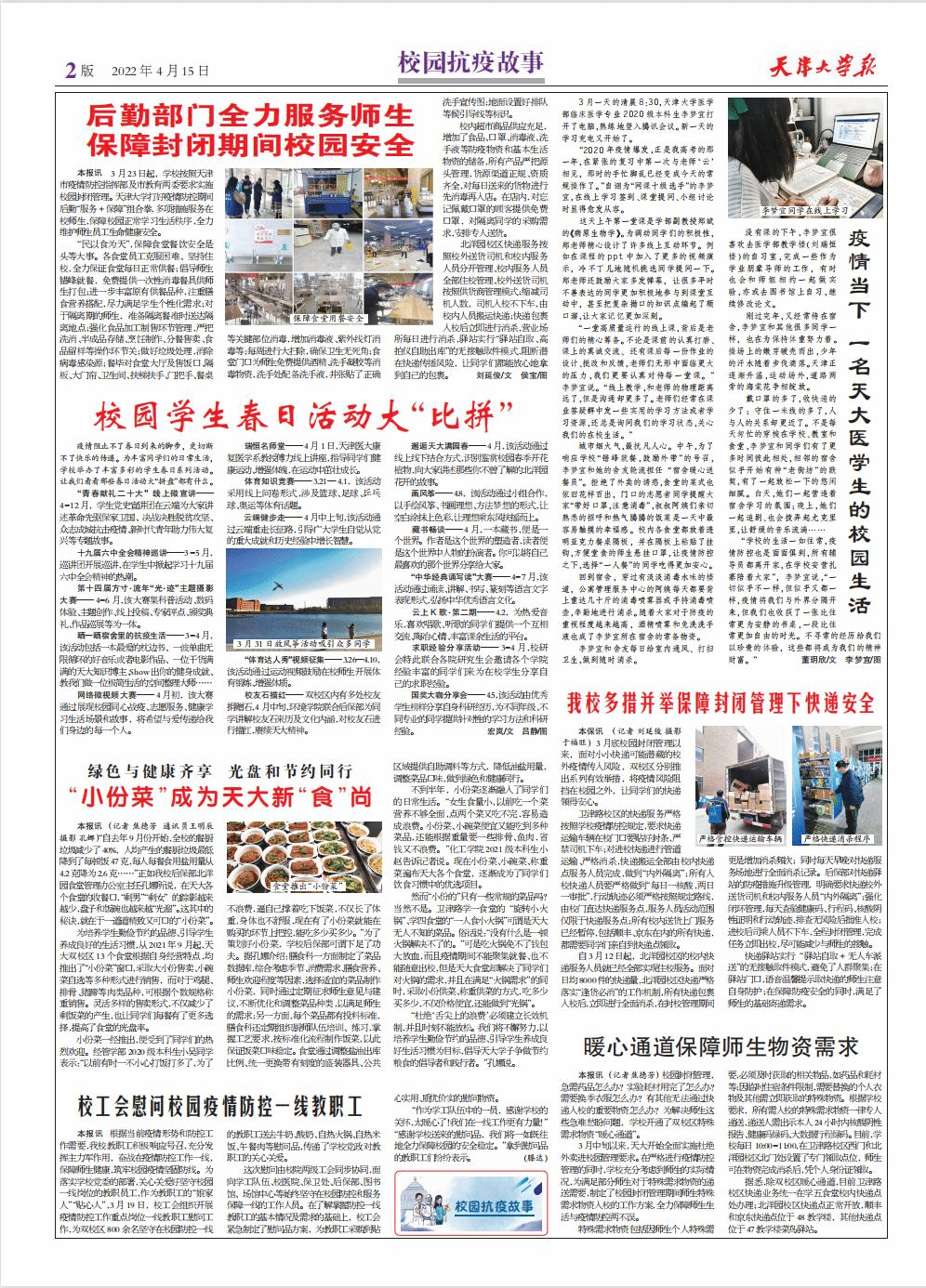 编者按 今年3月开学以来,全国疫情更加严峻,天津也爆发了又一轮疫情,学校按照上级要求进行封闭管理。师生和管理服务人员都进入到一种新的工作学习状态。疫情肆虐,教学科研却不能中断,老师们线上教学科研,学生们线上上课,后勤服务保障人员和辅导员及管理干部常驻校内,大家攻难克坚,保障正常的校园秩序,谱写了生动的抗疫之歌。这是一段特殊时期,大家的工作生活学习模式都发生了改变。本报特开设“校园抗疫故事”栏目,记录下这段特殊的校园生活。让我们走进疫情下的校园,看看师生们的生活是什么样子。
