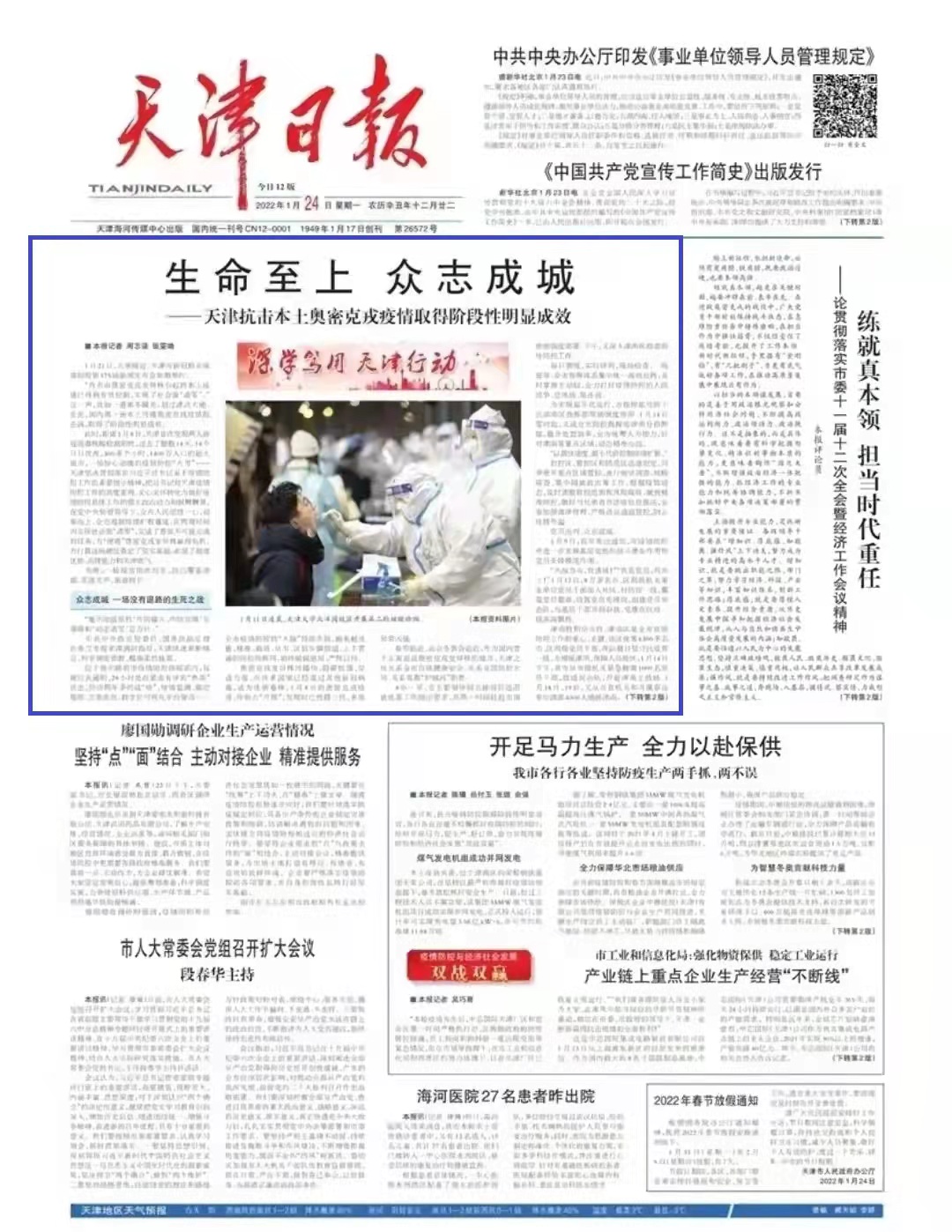 《天津日报》2022年1月24日头版头条