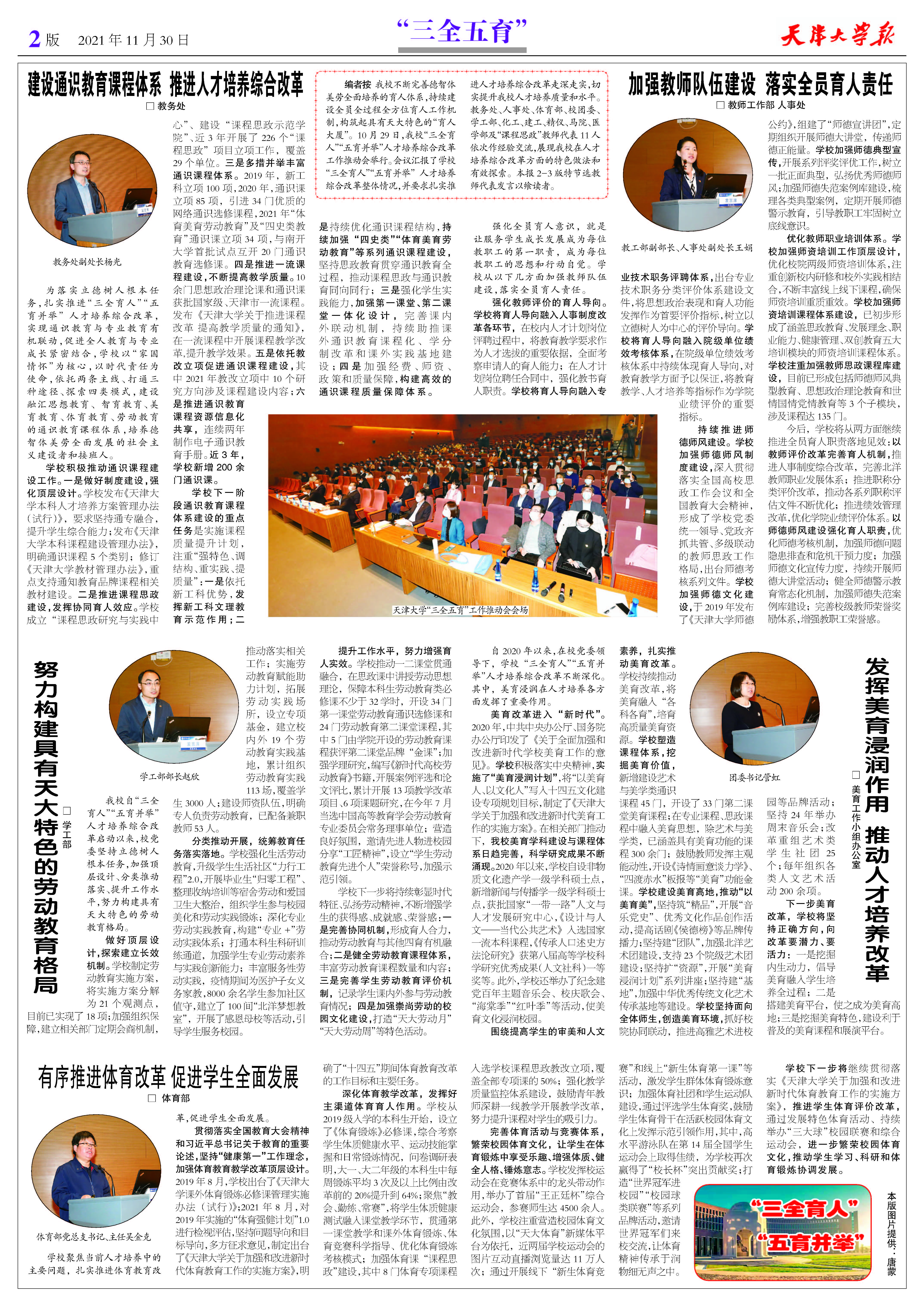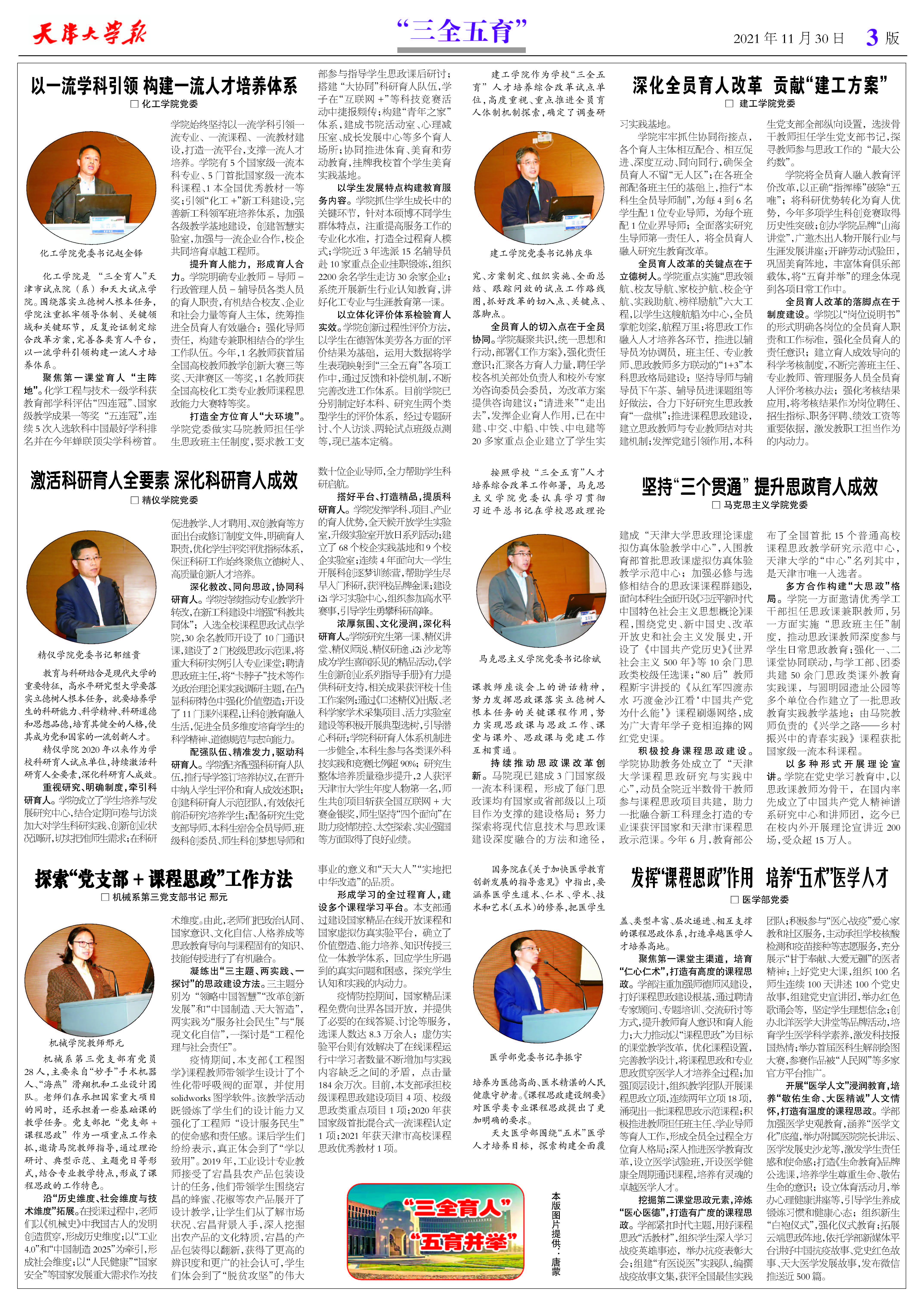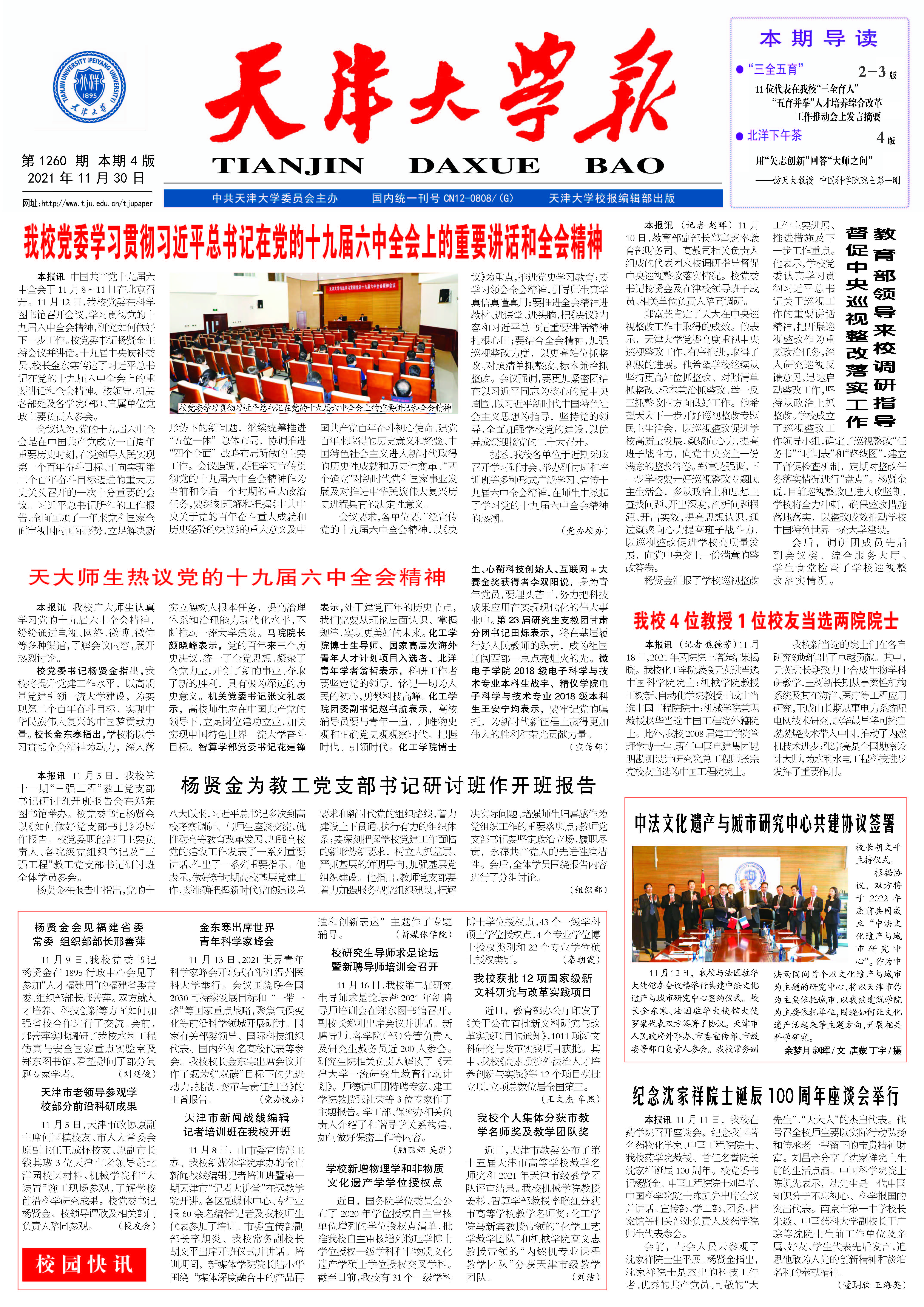 我校不断完善德智体美劳全面培养的育人体系,持续建设全员全过程全方位育人工作机制,构筑起具有天大特色的“育人大厦”。10月29日,我校“三全育人”“五育并举”人才培养综合改革工作推动会举行。会议汇报了学校“三全育人”“五育并举”人才培养综合改革整体情况,并要求扎实推进人才培养综合改革走深走实,切实提升我校人才培养质量和水平。教务处、人事处、体育部、校团委、学工部、化工、建工、精仪、马院、医学部及“课程思政”教师代表11人依次作经验交流,展现我校在人才培养综合改革方面的特色做法和有效探索。本报2-3版特节选教师代表发言以飨读者。