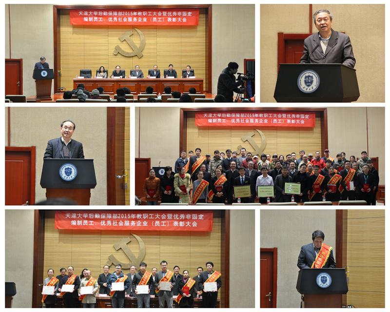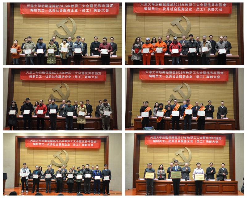本站讯(通讯员 周静)12月30日,后勤保障部在科技图书馆二层会议室召开了2015年教职工大会暨“优秀非固定编制员工”、“优秀社会服务企业(员工)”表彰大会。天津大学党委副书记、纪委书记兼工会主席汪曣、校长助理张力新、工会常务副主席马桂秋、人事处副处级调研员李庆刚以及后勤保障部领导班子成员、后勤保障部下属各部门职工代表、非编员工代表、企业代表等180余人参加了会议。大会由后勤保障部原党委副书记、副调研员杨书元主持。