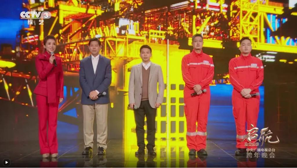 《启航2023——中央广播电视总台跨年晚会》情景讲述《筑梦深蓝》,演绎“深海一号”项目遇到技术瓶颈时,研发设计团队忘我攻坚的细节,以碧海丹心之志彰显了对于能源事业的热爱与奉献。