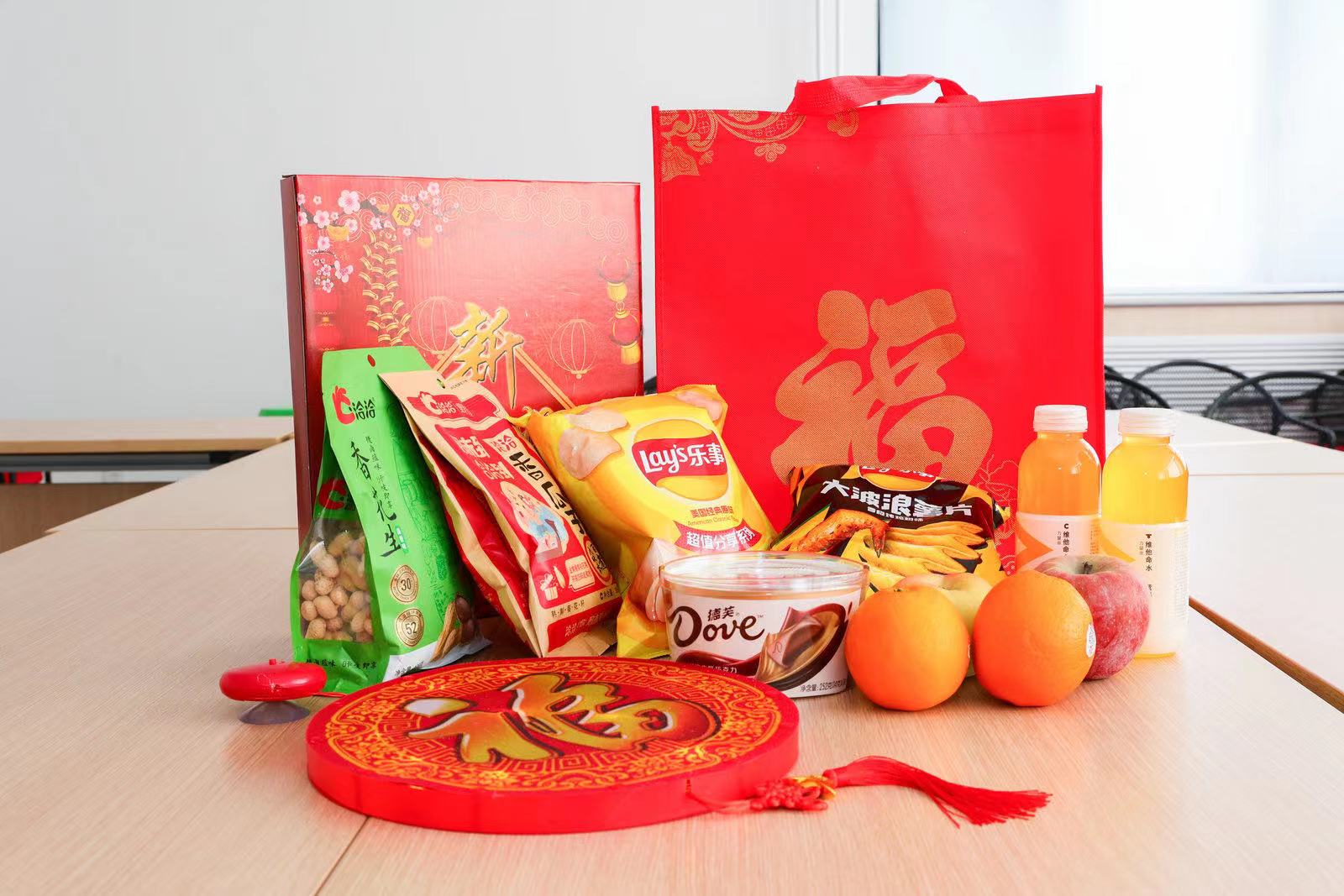 了解大家留校安排,询问同学们寒假在校的生活学习情况,倾听学生需求与新年计划……明东、韩庆华为在场的留校学生发放年货礼包,与同学们一同合影留念,向大家送上了贴心的新春祝福。嘱咐同学们,如果遇到什么困难、有什么需求,都可以第一时间和学院沟通,学校会为大家做好服务保障。每份礼包内都装载着学校对学生们的新春祝福:橙子,心想事“橙”;苹果,“苹苹”安安;福字,幸“福”吉祥……当然还有同学们最爱的薯片和饮料。