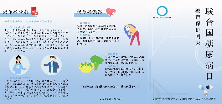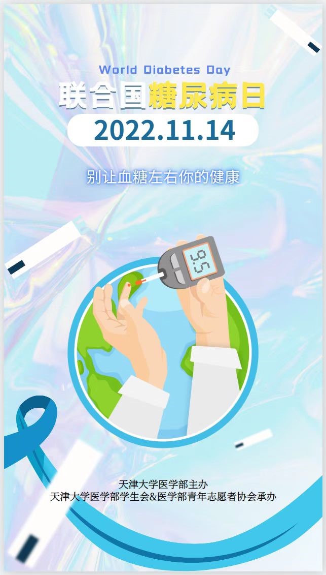 为增强学校师生对糖尿病的认识,帮助师生了解到更多糖尿病的防治知识,天津大学医学部学生会和医学部青年志愿者协会于2022年11月联合举办“教育保护明天-TJU联合国糖尿病日公益科普活动”,活动包括线上专题讲座、线上线下知识竞答、线下科普等环节,旨在让师生掌握更多糖尿病预防的相关知识,提高对健康生活重要性的认识,倡导积极向上的健康生活理念,同时也倡导同学们关爱和帮助受糖尿病影响的人群,营造不歧视不漠视、互帮互助的良好社会氛围。