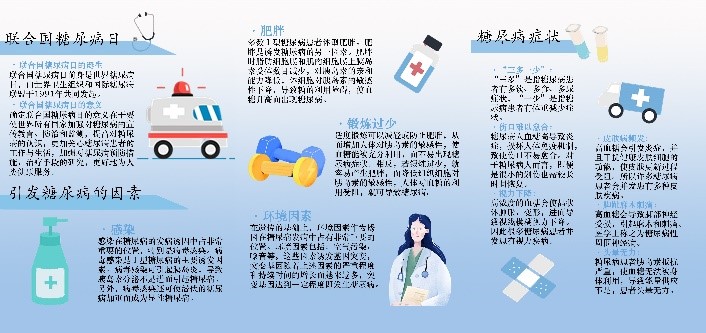 医学部学生会和医学部青年志愿者协会联合医学部文创工作室,设计制作了糖尿病宣传册和易拉宝,并在老校区学三食堂门口展出,向师生科普糖尿病的相关知识、预防措施、人文关怀等内容,帮助全校师生更好地了解糖尿病。