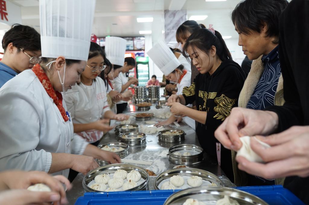 学生在食堂学习包子制作
