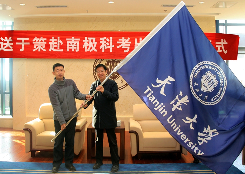 11月2日上午,天津大学在北洋园新校区行政楼贵宾室举办了一场特殊的出征仪式,该校校长李家俊向即将启程参加我国第32次南极科学考察的计算机学院副教授于策授予了一面天大校旗。于策作为此次南极科考天文组的核心成员,将登上位于南极大陆最高点的昆仑科考站,执行“南极巡天望远镜(AST3)”观测数据分析处理系统以及能源保障平台、台址监测气象站等设备系统的安装、升级与维护任务。这面天大校旗将在昆仑站展开,向世界展现天大人脚踏实地,“仰望星空”,致力于服务我国天文观测领域重大战略需求的“家国情怀”。