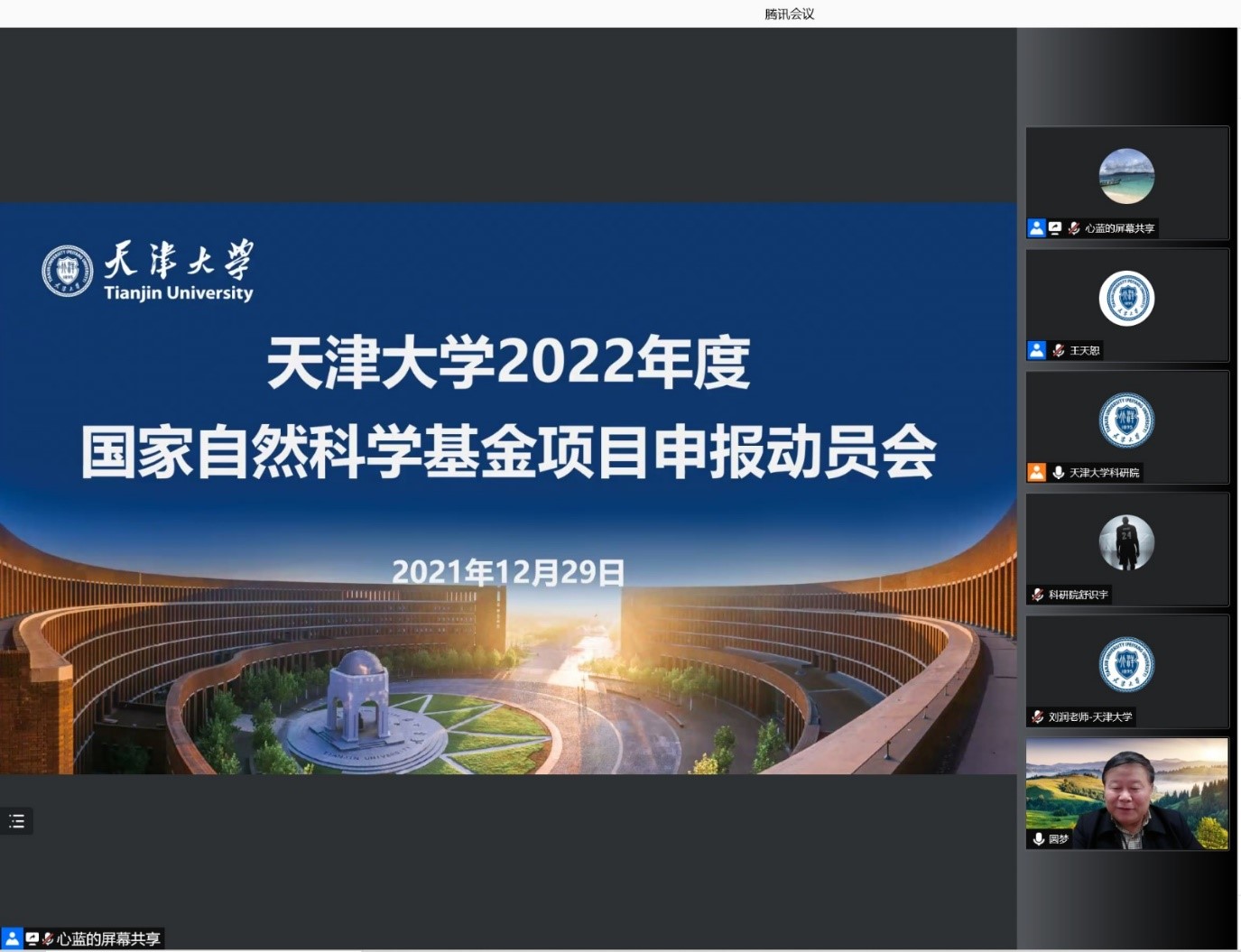 本站讯(通讯员 舒识宇 朱广明)为做好我校2022年度国家自然科学基金项目组织申报工作,充分宣讲2022年度科学基金改革要点和申请注意事项,全面动员我校教师基金申请积极性,12月29日下午,召开了天津大学2022年度国家自然科学基金申报动员会。受疫情影响,此次会议以线上形式召开。中国科学院院士、副校长元英进出席会议,天津大学各单位及附属医院主管科研领导、相关教师,以及学校对口支援高校青海民族大学共1000余人参加会议,会议由科研院副院长杨博主持。