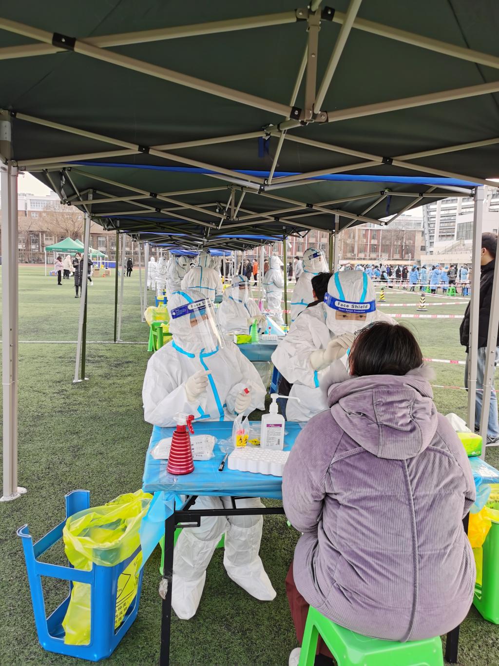 9日早晨7时全院医护药剂人员已经穿好防护服,等待任务命令。正是寒冬季节,再加上每采集完一次核酸就要用酒精进行一次手消毒,采集核酸的医务人员们的手指都变得红肿僵硬,但他们依然没有中断手中的采样工作。“刚才喝了口,润下嗓子就行啦,可不敢多喝,免得上厕所耽误时间。”校医院内科58岁的刘立娟主任和57岁的李玉珍主任向同事递来的水杯摆摆手。为减少上厕所的时间以及上厕所更换隔离装备而带来的防护资源浪费,她们不敢多喝一口水。虽然院领导下达过:年轻同志顶上,老同志要量力而行的“命令”,几个月前刚做完手术身体还没完全恢复的李玉珍主任仍坚持完成每一轮核酸采集工作才肯下来休息。校医院护士莫霁虹在参与了十余个小时核酸检测后,第二天依然坚持到院上班。当天下班她刚走出校医院大门又接到了紧急电话需要进行入户核酸采集任务。她二话不说立即返回办公室换上防护服,又到新园村、四季村连续入户采集核酸28人次……