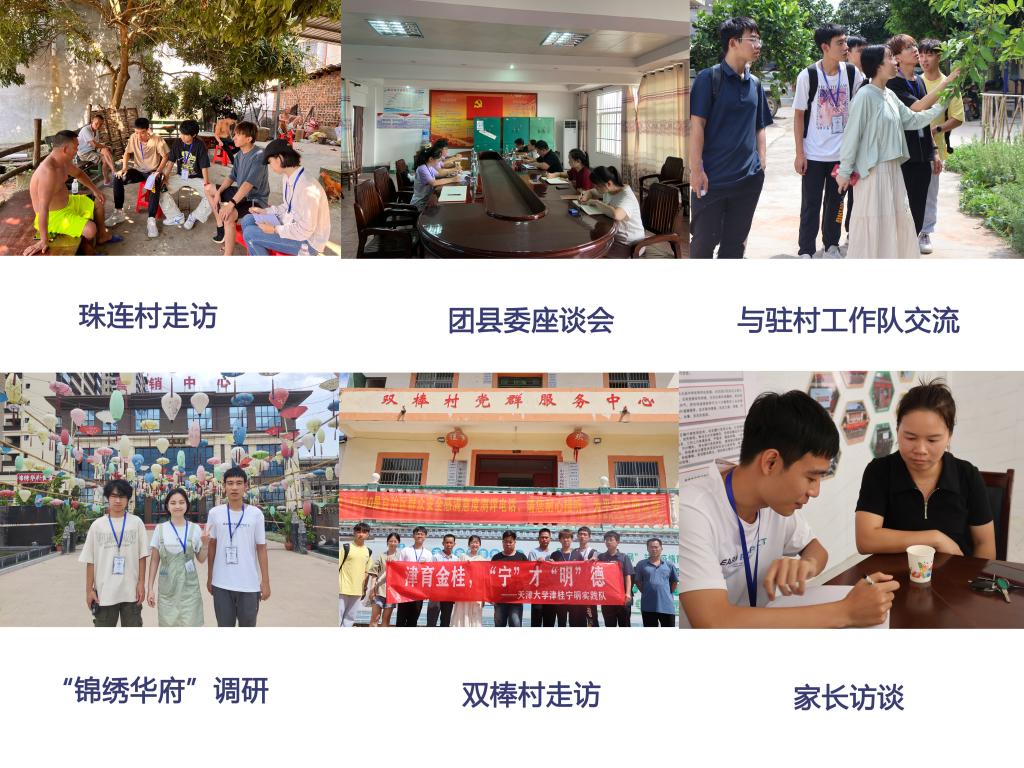 聚焦产业旅游和社会民情,实践队开展了“双线并行”的研学活动。在产业研学中,实践队分别从第一产业、第二产业和第三产业开展调研工作。7月8日,实践队走访了锦绣华府营销中心,与宁明县政协委员、广西崇左星和房地产开发有限公司董事长甘秀玲进行交流,围绕宁明县房地产发展问题与公司总经理苏吉开展了访谈。7月10日-12日,实践队分别前往宁明县城中镇珠连村驮河屯和宁明县东安乡双棒村进行实地走访。在珠连村驮河屯,峙浪乡中心小学教务处主任陈妮妮带领实践队成员参观了村庄,驮河屯组长何文伟向实践队成员介绍了村庄的基本情况,大家围绕农业建设开展了交流座谈。在东安乡双棒村,村“两委”干部与实践队成员开展了主题为“凝聚青春担当 助力乡村振兴”的座谈交流,村党总支部书记、村委主任邓喆介绍了双棒村的历史和基本情况,驻村工作队队员带领实践队成员走访了双棒村,介绍了“庭院经济”和文化建设的工作情况。7月12日,实践队前往城中镇荷城街和花山广场开展走访调研,与宁明县文化和旅游局选调生何迎庆开展交流,围绕美食及旅游调查了当地的基本情况,为制作精品旅游路线及宣传宁明旅游资源奠定基础。