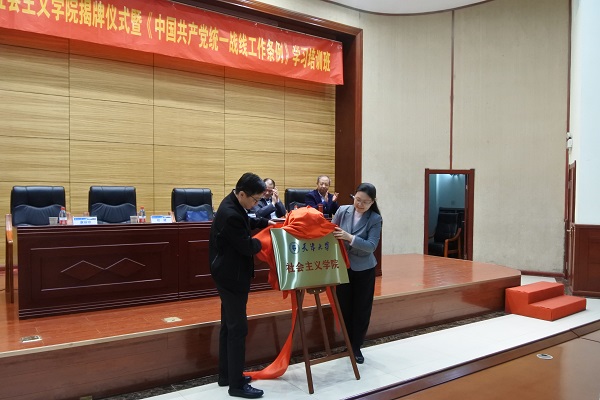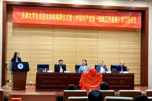 本站讯(通讯员 李莉)3月25日下午,天津大学社会主义学院揭牌仪式暨《中国共产党统一战线工作条例》学习培训班开班仪式在卫津路校区科学图书馆二层报告厅举行。天津市政协委员、市政协民族宗教专门委员会原主任、市社会主义学院原党组书记王竞,天津市教育工作委员会统战处处长祝建,天津大学党委副书记赵美蓉,天津大学党委常委、校长助理、统战部部长张力新等出席揭牌仪式。党委统战部副部长康丽琼主持仪式。