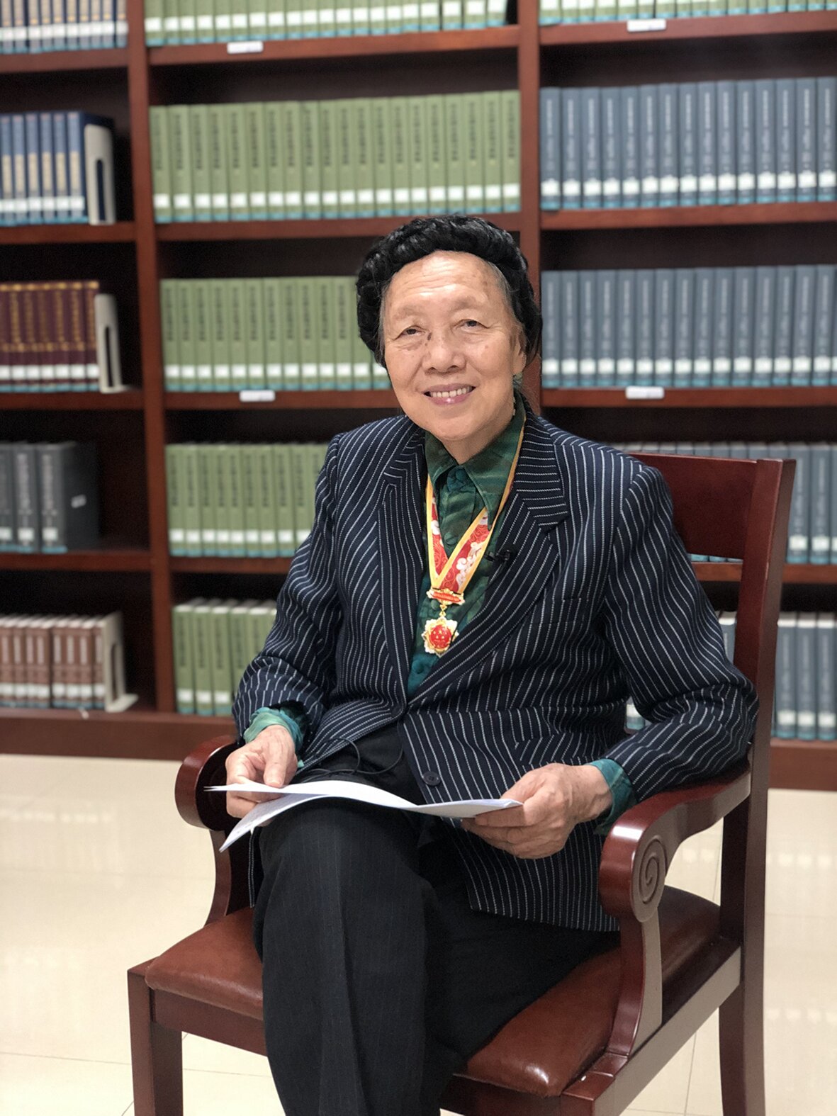 与王先生的访谈约在金秋九月的图书馆。先生准时坐在了大书桌前,还是那身朴素的蓝条西装,还是那件经典绿花真丝衬衣,还是那专注认真的坐姿,女神依旧。从来不施粉黛、不戴饰品的女神,这回要求戴上一件饰品。她缓缓地从包里拿出了一个礼盒:由中共中央、国务院、中央军委共同颁发的“庆祝中华人民共和国成立70周年纪念章”。装上祥云绶带,王先生郑重地将纪念章挂在了胸前。阳光下先生的眼睛与胸前胸章,熠熠发光。光晕中的先生依然知性、美丽,岁月从不败美人。“女神”不老。
