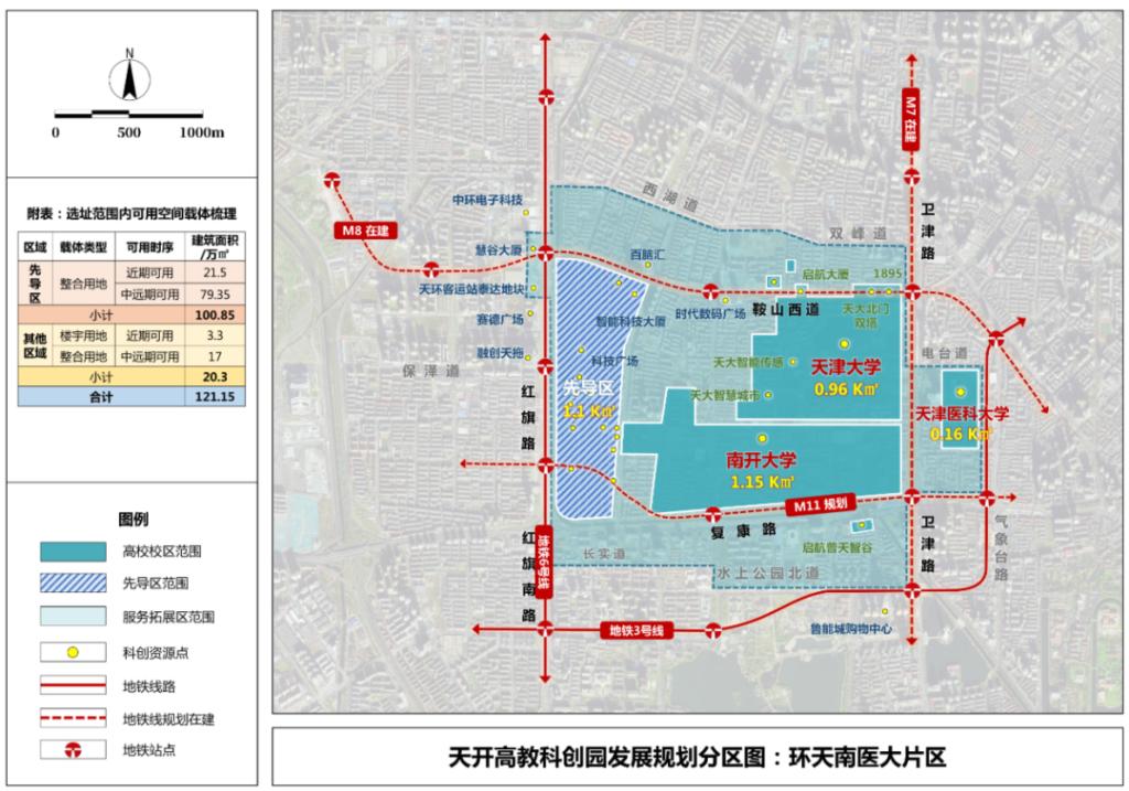 核心区内划定“鞍山西道—白堤路—复康路—红旗路”合围区域为先导区,占地面积约1.1平方公里。以天津科技广场为核心、科研西路为中轴向两侧延伸的11个空间载体为主要供给,可提供总占地面积22.05万平方米、总建筑面积100余万平方米的载体空间。