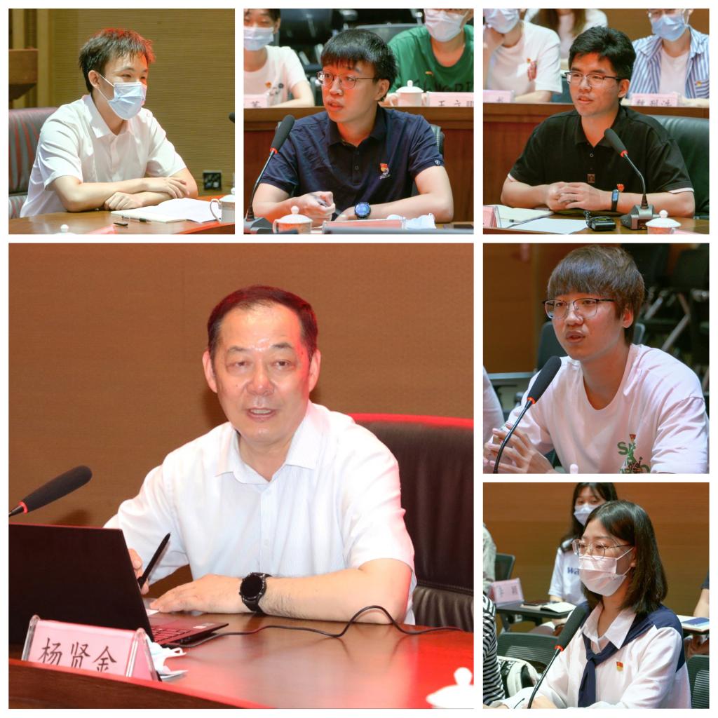 在交流座谈中,杨贤金嘱托同学们,要坚定理想信念,坚持正确政治方向,坚守共产党人的精神追求,做到对党忠诚,从党的百年奋斗史中汲取奋进力量,增强“四个意识”,坚定“四个自信”,做到“两个维护”,始终同以习近平同志为核心的党中央保持高度一致。要努力学习科学文化知识,构建完整的知识体系,摒弃功利化倾向,注重培养表达能力、批判性思维以及跨文化理解能力。要不断提高道德修养,深入学习习近平法治思想,把对法律的敬畏转化为自身思维方式和行为方式,遵纪守法、自律清廉,时刻保持清醒的头脑。要勇于攻坚克难,作为青年学生,要“自找苦吃”,当几回热锅上的蚂蚁,直面困难和挑战,锲而不舍、久久为功,一步一个脚印把各项工作都做好。要有积极乐观的精神,努力化消极为积极,化被动为主动,善于合作,保持谦逊,学会欣赏他人,常怀感恩之心,用自己的努力回馈家人和社会。