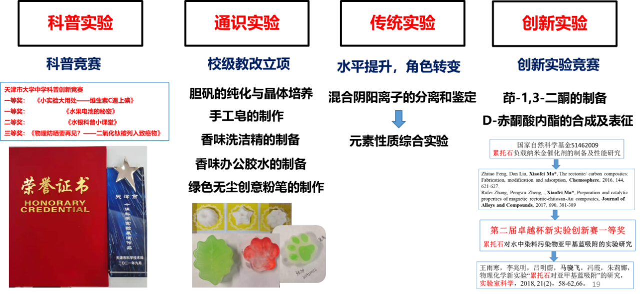 为配合学校学分制改革和贯通培养要求,中心构建基础化学实验教学项目93项,充分满足了校内外不同层次学生的个性化培养需求。例如,通过科普竞赛构建的科普实验项目,服务于广大中小学生;通过教改立项整合生化中的化学实验,着眼于通识教育,服务对象主要是是非化类本科生;对传统实验进行水平提升和角色转变的改造,面向化类本科生,深入培养专业能力;把科研成果转化为学生竞赛,再转化为教改论文,进而形成创新实验项目,服务应用化学理科生和化工领军班的学生培养;面向高年级应用化学理科生及或化学专业研究生,因材施教调整理论计算与化学合成实验路线设计,形成了专门的计算化学实验。此外,还通过虚拟仿真实验,着力承接工业单元操作和高危实验等实践类课程,有效规避各类风险。