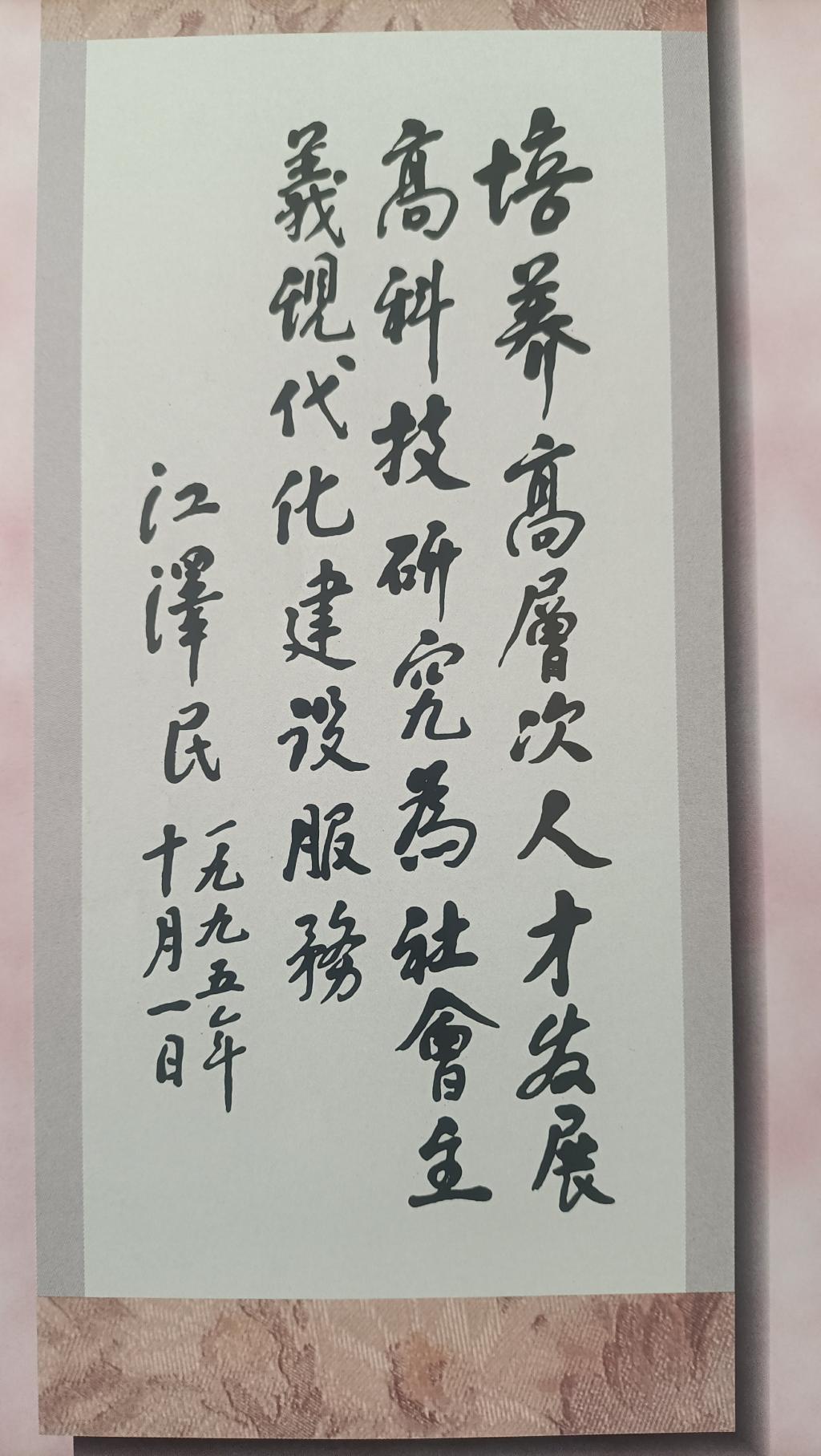 1995年10月2日,天津大学建校100周年之际,江泽民同志为天津大学校庆题词:“培养高层次人才,发展高科技研究,为社会主义现代化建设服务”,勉励天大师生,继续在科研报国之路上奋勇前行。在党和国家主要领导人的亲切关怀和有力支持下,天津大学为国家培养和输送了大量高质量的社会主义建设人才,取得了丰硕的科研成果,为国家的经济建设和社会发展作出了重大贡献,并将继续为全面建成社会主义现代化强国团结奋斗。
