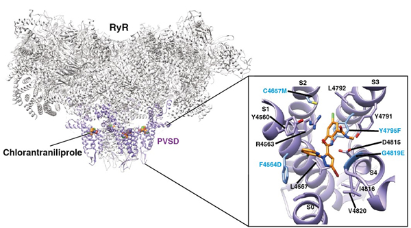 在该研究中,团队成功获得了分辨率为3.8Å的氯虫苯甲酰胺与鱼尼丁受体复合物冷冻电子显微镜结构。结构清晰揭示出氯虫苯甲酰胺结合在通道的电压感受功能域,通过拉动S4-S5链接螺旋,引起通道孔区的开放,从而造成钙离子的持续释放,达到杀虫效果。有趣的是,四个已知的抗性突变都围绕在药剂结合口袋的附近,却以两种截然不同的形式影响药物的结合。研究人员综合细胞荧光实验、突变果蝇实验和定量计算分析,阐明了氯虫苯甲酰胺高物种选择性的分子基础,并且预测了另一类重要双酰胺类药剂氟苯虫酰胺的作用模式。同时研究人员还提出了针对双酰胺结合位点设计药物治疗人类肌肉疾病和心脏疾病的新思路。此项成果为基于鱼尼丁受体靶标的药物筛选和理性设计提供了准确的结构模版和理论基础,具有十分深远的意义。