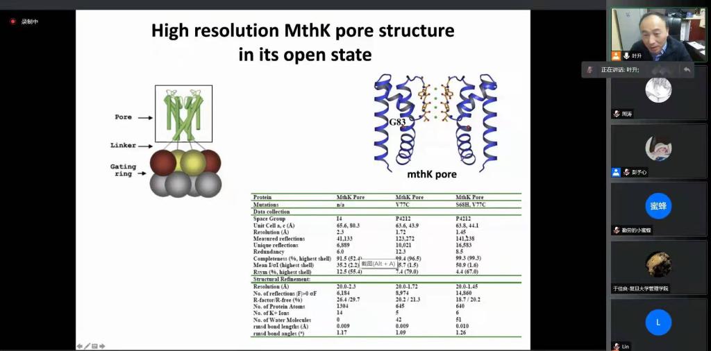 “叶院长的讲座,让我对钾离子通道的离子选择机制有了更深的了解。叶院长向我们展示了钾离子通道的研究历史、三维结构和离子结合位点等,让我明白了钾离子通道的结构信息以及相应的作用机制。在疫情当中能够有这样一个机会,通过线上讲座接触前沿的科研领域对于我来说是难能可贵的,我也希望能够将讲座中所收获的知识应用于科研学习当中,探索人类的奥秘,破解人类的‘运行密码’。”听完讲座,生命科学学院2019级本科生杨小龙说。
