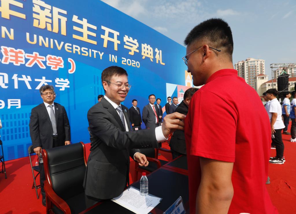 典礼在洪亮的国歌声中开幕。金东寒校长在开学典礼上讲话,为“新天大人”送去期许和祝福。教育学院院长闫广芬教授、2019级硕士研究生赵丹宁分别代表在校教师和学生发言,欢迎新生到来。化工学院化工能源与生命医药类2020级本科生谈家宁作为新生代表发言,表达求学报国之志。校领导还为新生代表佩戴上天大校徽,在场师生齐唱校歌“共扬校誉于无穷”。