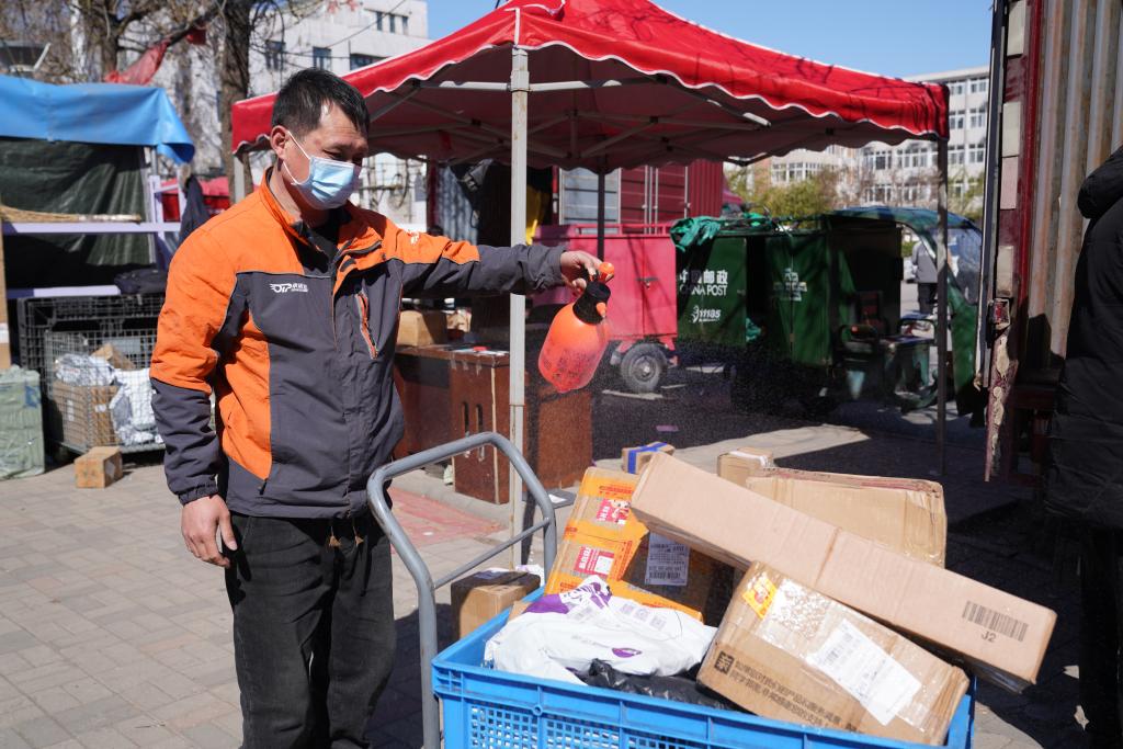 在北洋园校区,校内快递服务点的工作人员正在对刚进校的快递车辆进行消杀。面对日均8000件的快递量,北洋园校区快递严格落实“逢货必消”的工作机制,所有快递包裹入校后,立即进行全面消杀,在封校管理期间更是增加消杀频次,同时每天早晚对快递服务场地进行全面消杀记录。