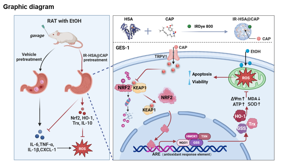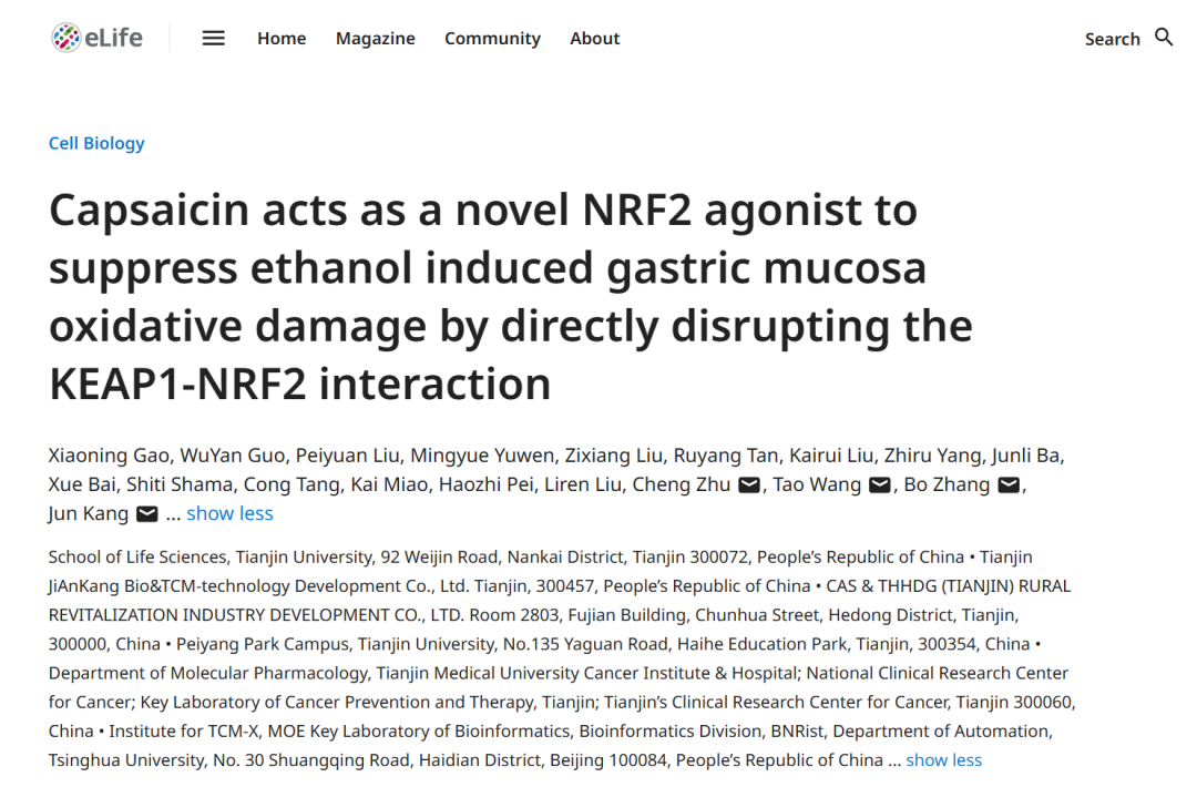 本站讯(记者 梁绍楠)酒是生活中常见的一种饮品,承载着人类的情感与文化,但过量饮酒可能会造成机体损伤。日前,天津大学生命科学学院康君副教授团队研究发现,辣椒碱可以激活胃内抗氧化系统,预防酒精所致的急性胃粘膜损伤,此外,该团队发明的由白蛋白包被的辣椒碱纳米制剂可以显著提高药物溶解度和递送效率,在酒精导致的急性胃粘膜损伤大鼠模型中表现出卓越的抗氧化和抗炎效果,证明了该研究结果的应用潜力。相关成果已发表于生物学科领域顶级学术期刊《eLife》。