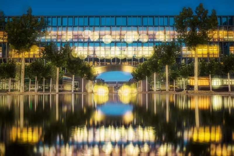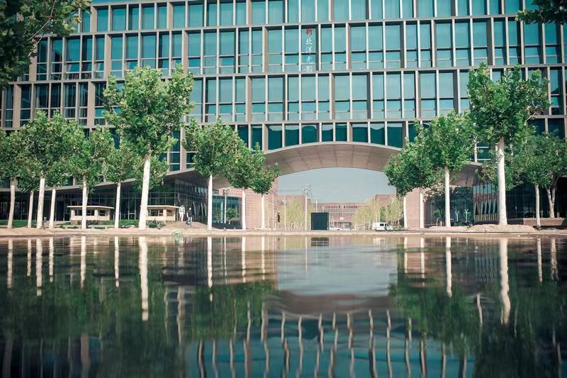 郑东图书馆由天大知名校友、中国建筑师的最高荣誉“梁思成建筑奖”获得者周恺领衔设计,总体借鉴中国传统设计的“庭院”为中心的空间模式,营造一个具有现代校园精神的公共性、开放性文化场所。正门入口两侧各立有一株西府海棠,枝繁叶茂、硕果累累,中央庭院内法桐树亭亭如盖,浅池湛湛水蓝。春赏海棠,夏看繁枝、秋踏梧桐、冬拂白雪,四季在这里流转,日日夜夜伴着莘莘学子踏入知识的殿堂。