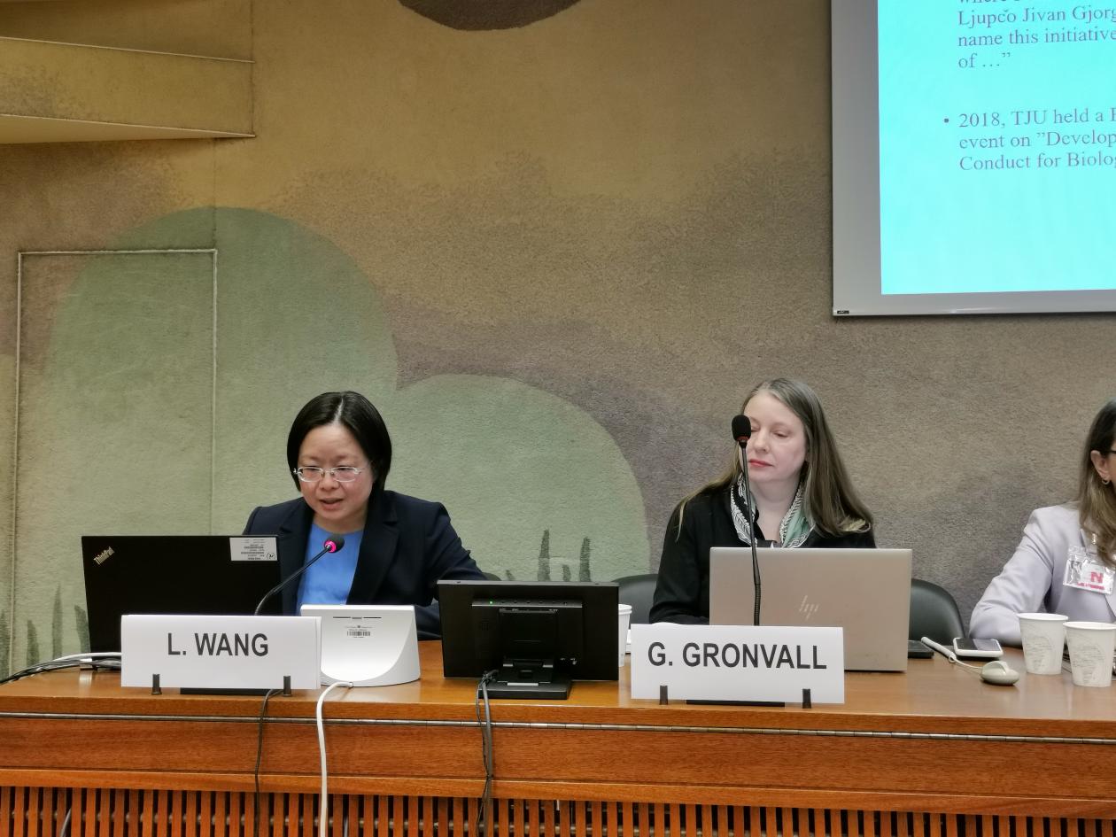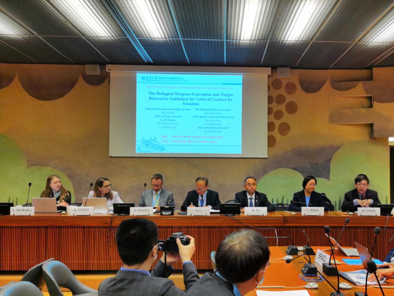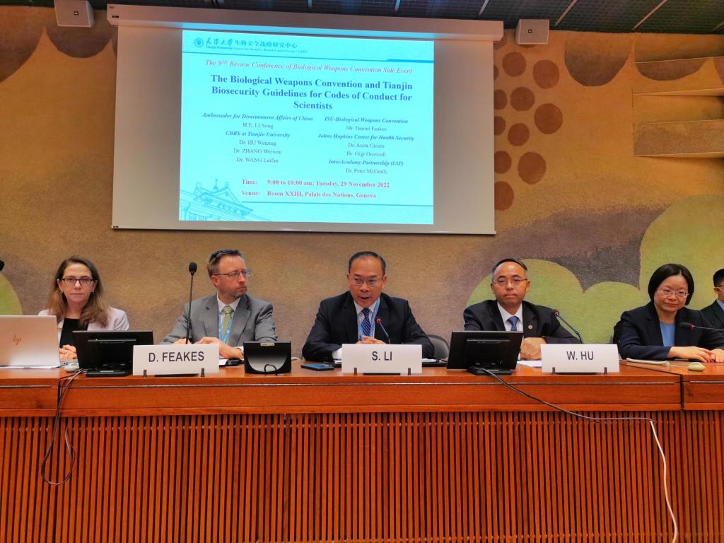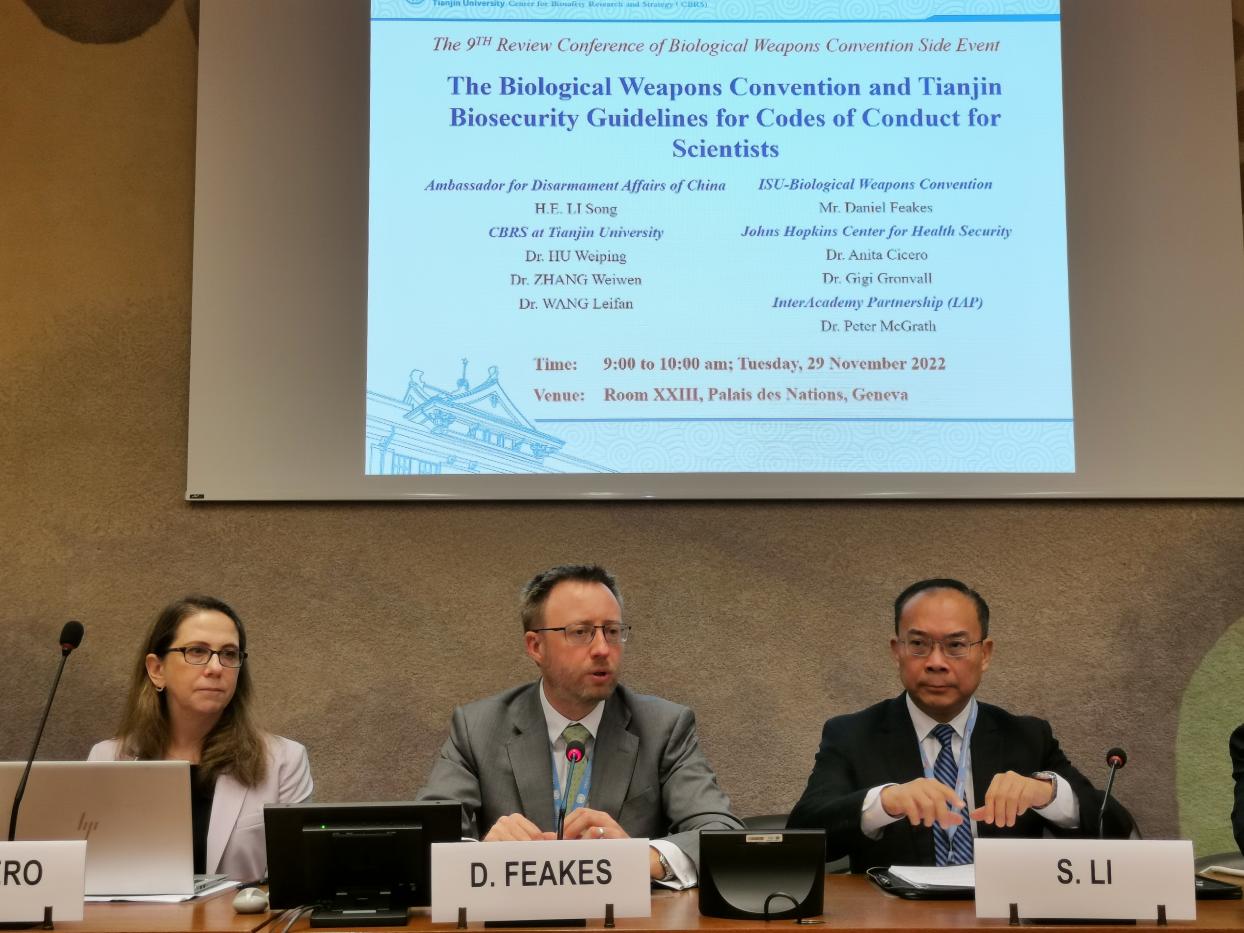 本站讯《禁止生物武器公约》(以下简称《公约》)第九次审议大会正在日内瓦万国宫召开。11月29日,天津大学生物安全战略研究中心与中国外交部在联合国欧洲总部日内瓦万国宫内共同举办《禁止生物武器公约》与《科学家生物安全行为准则天津指南》(以下简称《天津指南》)主题边会。中国出席《公约》九审会代表团团长、裁军事务大使李松,《公约》履约支持机构负责人、九审会秘书长Daniel Feakes,天津大学常务副校长胡文平出席会议并致辞。会议由天津大学生物安全战略研究中心主任张卫文主持,天津大学、美国约翰斯·霍普金斯健康安全中心、国际科学院组织(IAP)专家陆续做主题发言。中国代表团以及九审会主席国意大利、美国、俄罗斯、巴基斯坦、巴西、南非、新加坡、伊朗等数十国八十余位官员以及科研机构和民间团体出席。