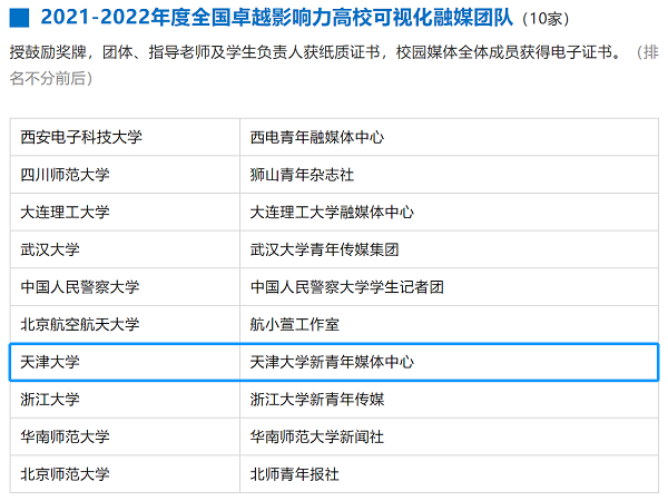 前期,2021-2022年度“全国高校可视化融媒团队”名单正式公布,天津大学新青年媒体中心从全国数千家校园媒体中脱颖而出,获评“2021-2022年度全国卓越影响力高校可视化融媒团队”。这是继天津大学新青年媒体中心两度蝉联年度全国十佳高校媒体后,再次斩获殊荣。