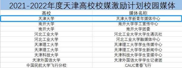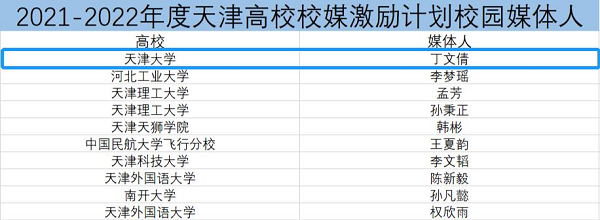 今年五月,2021-2022年度天津高校校媒激励计划风采展示校园媒体名单和校媒人名单公布,天津大学新青年媒体中心和新青年媒体中心主任、法学院2021级硕士研究生丁文倩成功入选并分别位列第一。