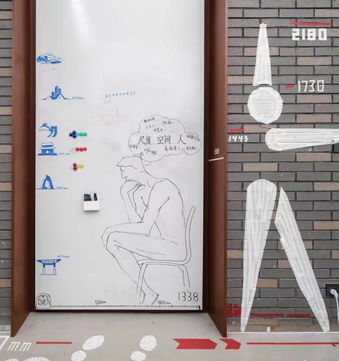朱老师提到的作业是建筑学院本科一年级刚刚完成的尺度认知作业。建筑设计除外观设计之外,还要根据人体尺度、行为尺度精准地把握房间尺度、家具尺度。空间尺度认知是建筑学院学生的第一课。一年级学生对北馆的门、窗、楼梯、柱子、走道等基本建筑构件进行了尺寸标注,测量标注的过程中,同学们还把“自己”摆了进去,他们对成年男性、女性、儿童、猫狗等“活物”的尺度进行标注,画在门口、窗前、楼梯、走道,不仅创意地装饰了教室,还能让每个进入教学楼的人可以沉浸式地感受各种空间尺度。