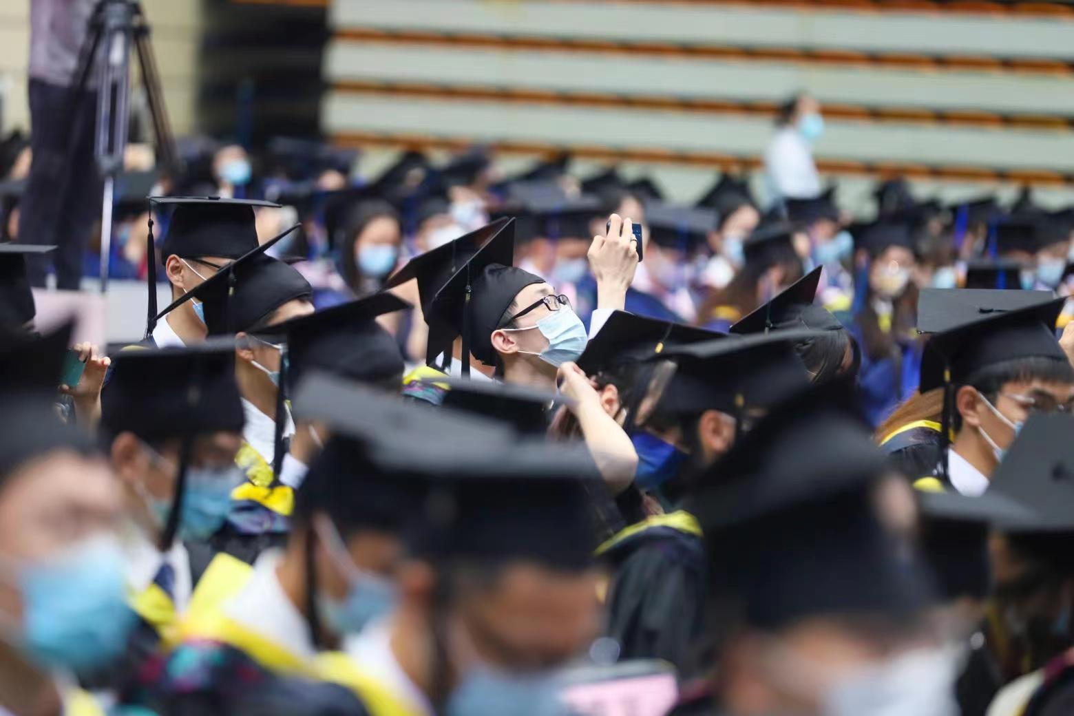 本站讯(记者张华 摄影唐蒙、刘延俊)荷叶亭亭绿满塘,硕果累累满枝香。6月9日一早,在天津大学卫津路校区400名毕业生代表们身着学位服在体育馆里有序就坐,一个个充满着收获的喜悦,共同见证完成学业的美好而庄严的时刻。今年由于疫情影响,大家无法共聚一堂,更多即将毕业的同学们通过网络直播的方式参加了这场青春盛典。毕业生们的父母、亲朋也可以“千里共云端”,共同见证和分享自己孩子学业有成的喜悦。