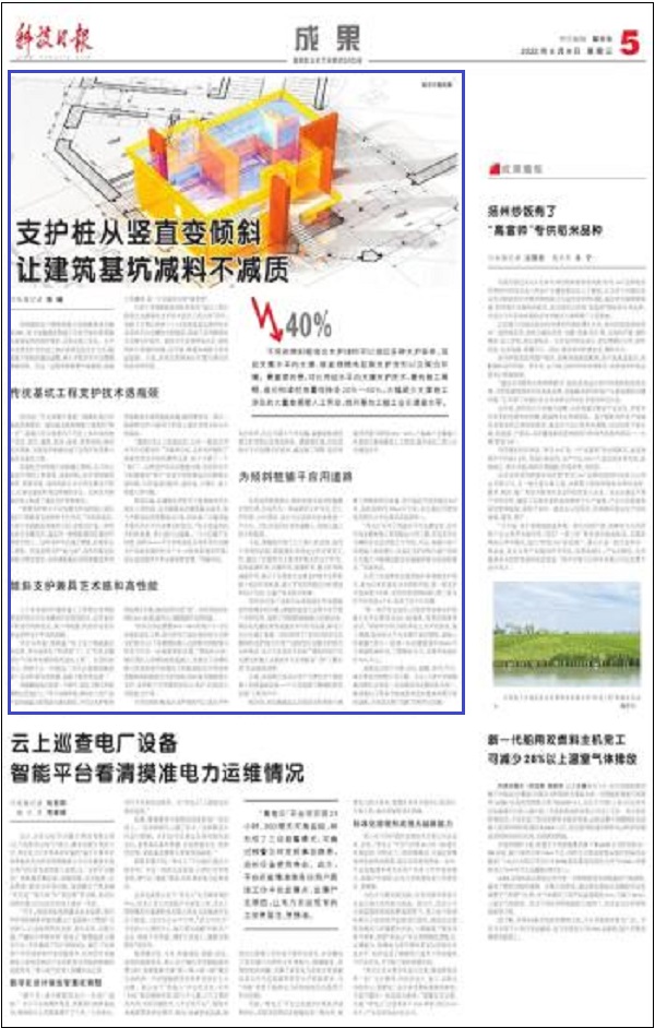 天津大学郑刚教授团队研发的“基坑工程自稳型无支撑绿色支护技术及其工程应用”项目,突破了长期以来地下1—2层深度基坑围护体系采用水平内支撑技术的瓶颈,形成了系列倾斜桩无支撑支护技术。新技术可显著降低水泥、钢筋和砂石等建材消耗,在节能、降耗和减碳方面效益显著。日前,该项目获得2021年度天津市科技进步特等奖。