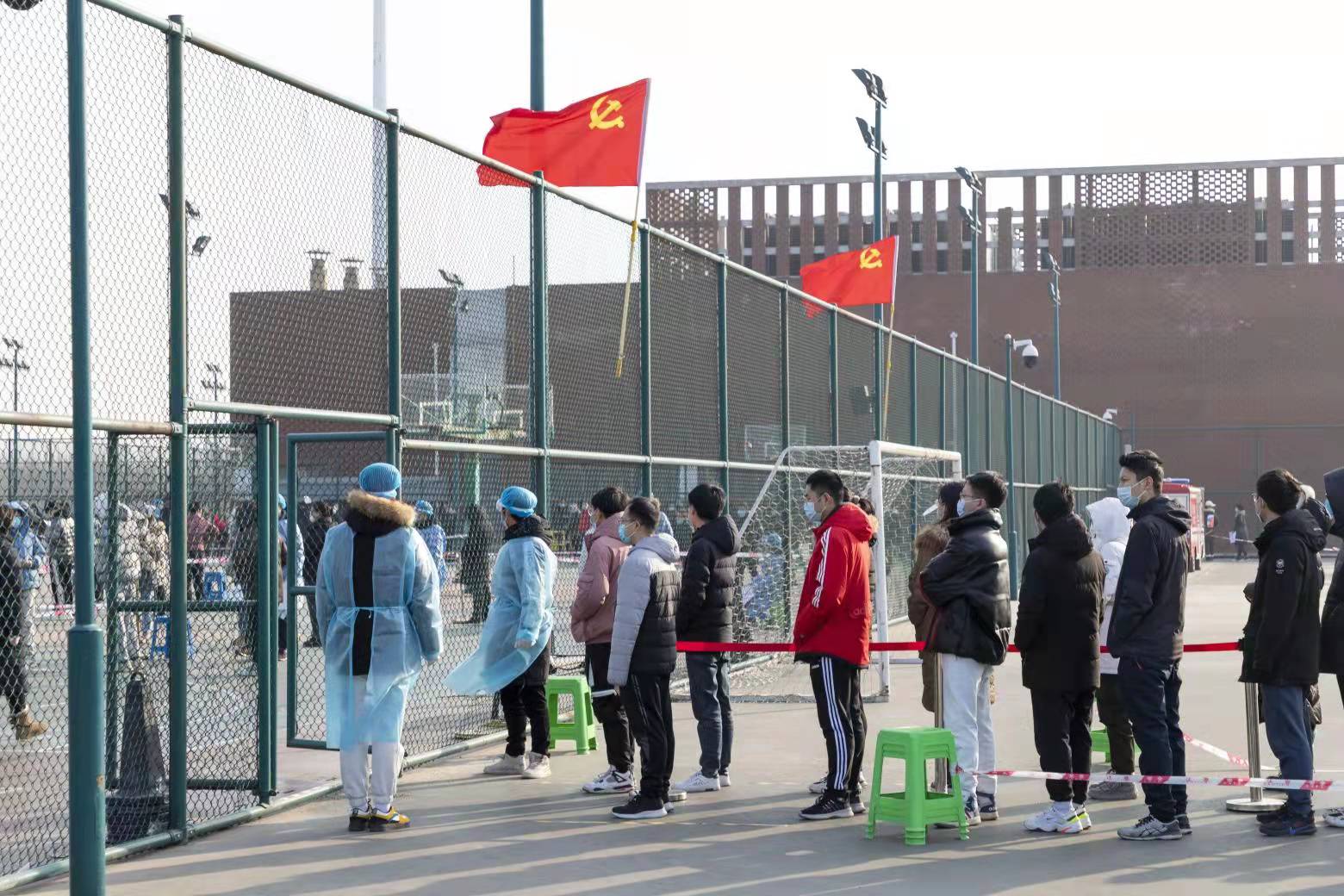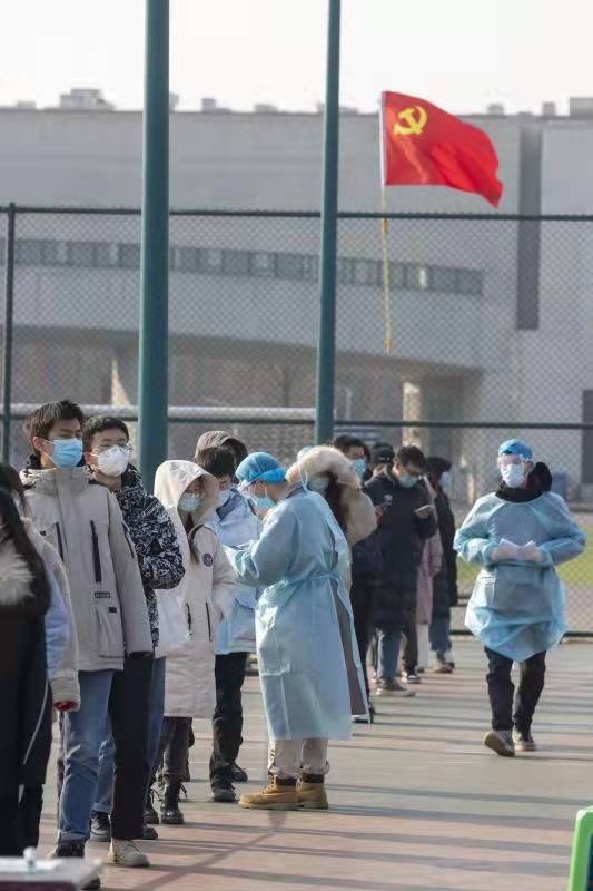 本站讯(记者刘晓艳 图片刘延俊)在天津大学北洋园校区1月14日开展的第四轮核酸大筛现场,党旗迎着猎猎寒风高高飘扬。