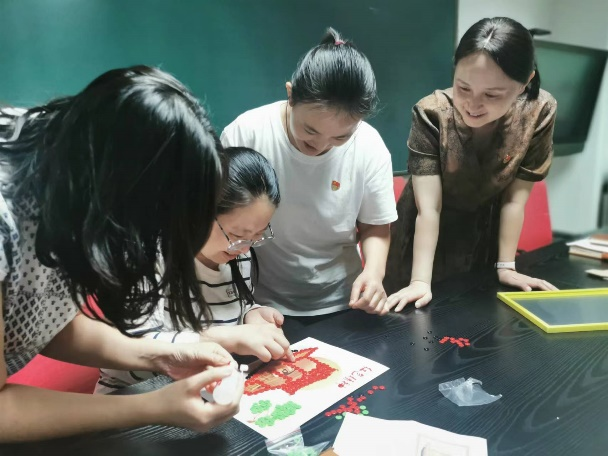 师生分小组开展了纽扣画拼贴,用一颗颗小纽扣汇聚成鲜红的旗帜、辽阔的版图、启航的红船,大家分工合作、严谨细致,坚持“一点都不能错”“一点都不能少”。