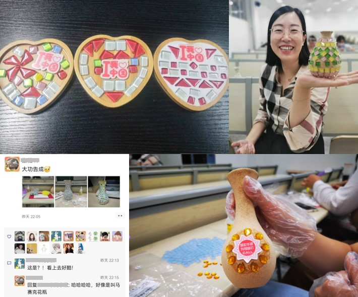 美观实用的杯垫和花瓶是提升环境、愉悦心情的小物件,老师和同学们自由选择材料,充分发挥创意,制作了形形色色独一无二的桌面风景,把对祖国的爱镶嵌其中。很多老师和同学们表示创意活动“很酷”,非常减压,提升了幸福感。
