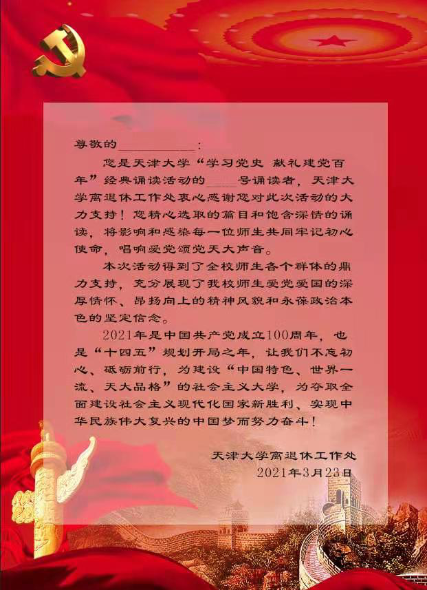 在中国共产党百年华诞之际,为重温党的光辉历程,牢记党的初心使命。坚决做到学史明理、学史增信、学史崇德、学史力行,天津大学离退休工作处特举办《信仰之路》——天津大学离退休教职工“学习党史 献礼建党百年”百人百日百篇百词经典诵读巡展。活动精选十本红色书籍,设置100个主题,邀请离退休老同志、在职教工党员、青年学生共计100人,接力诵读优秀篇章与感人段落。从建党百年倒计时100天开始,采用每天推出一篇朗读文稿的模式,以“100名朗诵者、100篇经典诵读”的形式隆重庆祝中国共产党成立100周年。