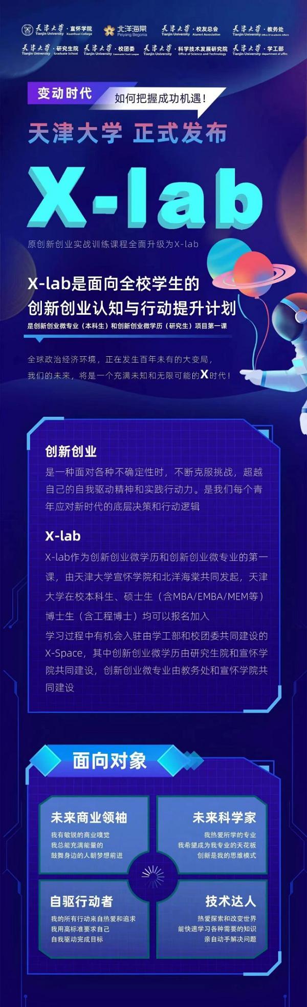 X-lab由天津大学宣怀学院和北洋海棠基金共同发起,天津大学在校本科生、硕士生(含MBA/EMBA/MEM等)和博士生(含工程博士)均可以报名加入。在学习过程中,还有机会入驻由学工部和校团委共同建设的X-space,其中创新创业微学历由研究生院和宣怀学院共同建设,创新创业微专业由教务处和宣怀学院共同建设。