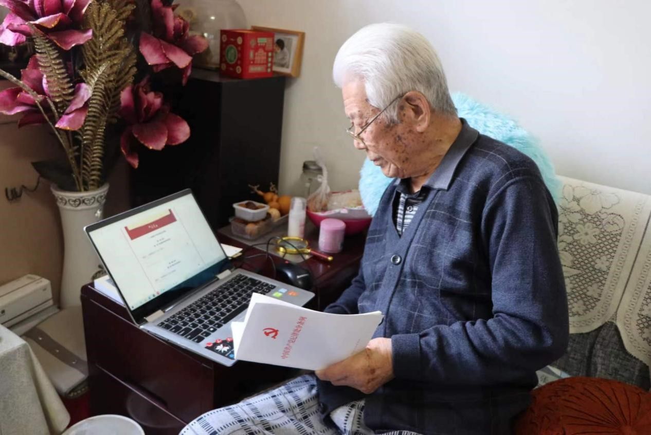 图注:91岁高龄的离休干部王珍玺,居家认真收听学校离退休工作处微信公众号“老党员之声”“党纪学习教育专栏”中同志们朗读的《中国共产党纪律处分条例》