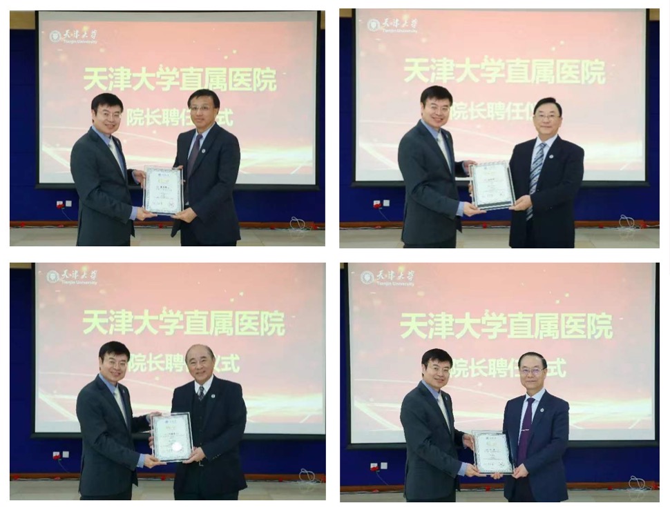 天津大学党委宣布了对天津大学泰达医院、天津大学泰达国际心血管病医院和天津大学滨城医院的院领导聘任决定。中国工程院院士、天津大学校长金东寒为受聘的各位直属医院领导颁发聘书。泰达国际心血管病医院党委书记、院长刘晓程,泰达医院院长张立群,滨城医院院长张赛分别代表医院领导班子进行发言。他们对学校和滨海新区的信任和支持表示感谢,并指出将带领医院全面贯彻落实校院双方医教协同创新、医工交叉融合,积极助力高质量医学人才培养,大力提升医院学科发展水平,服务学校医科建设。同时,将进一步提高服务新区医疗需求的能力建设,共同形成辐射全市乃至服务全国的高水平医疗卫生体系。