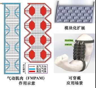 基于此创意,课题组首先提出了一种新型气动人工肌肉,可应用于柔性外骨骼等人机交互装备的驱动中。气动即以压缩空气为动力源,带动机械完成伸缩或旋转动作。