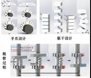 此外,课题组还提出了一种新型气动管道爬行机器人,可应用于工业管道设施的检查和实时监控。该管道爬行机器人采用仿生尺蠖原理,通过巧妙布置薄膜气缸单元之间的连接,实现机器人在管道内、外壁面爬行。