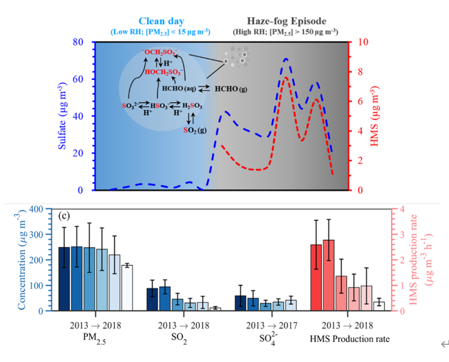 图1上图:北京大气气溶胶中SO42-和HMS的转变特征;下图:2013-2018年间重污染发生时PM2.5、SO2和SO42-的含量及HMS生成速率