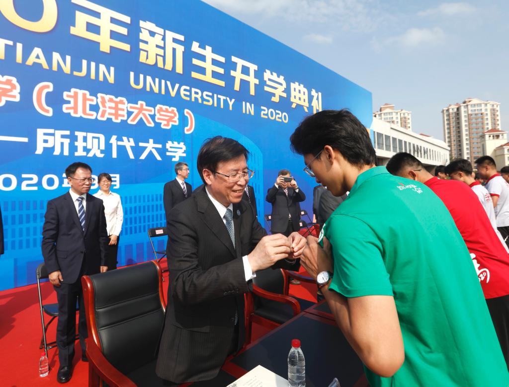活动中,校领导还为新生代表佩戴校徽,将沉甸甸的期望和祝福寄托给了天大的“后浪”。“望前驱之英华卓荦,应后起之努力追踪。”天大师生齐声高唱天大校歌,憧憬美好未来,“共扬校誉于无穷”。