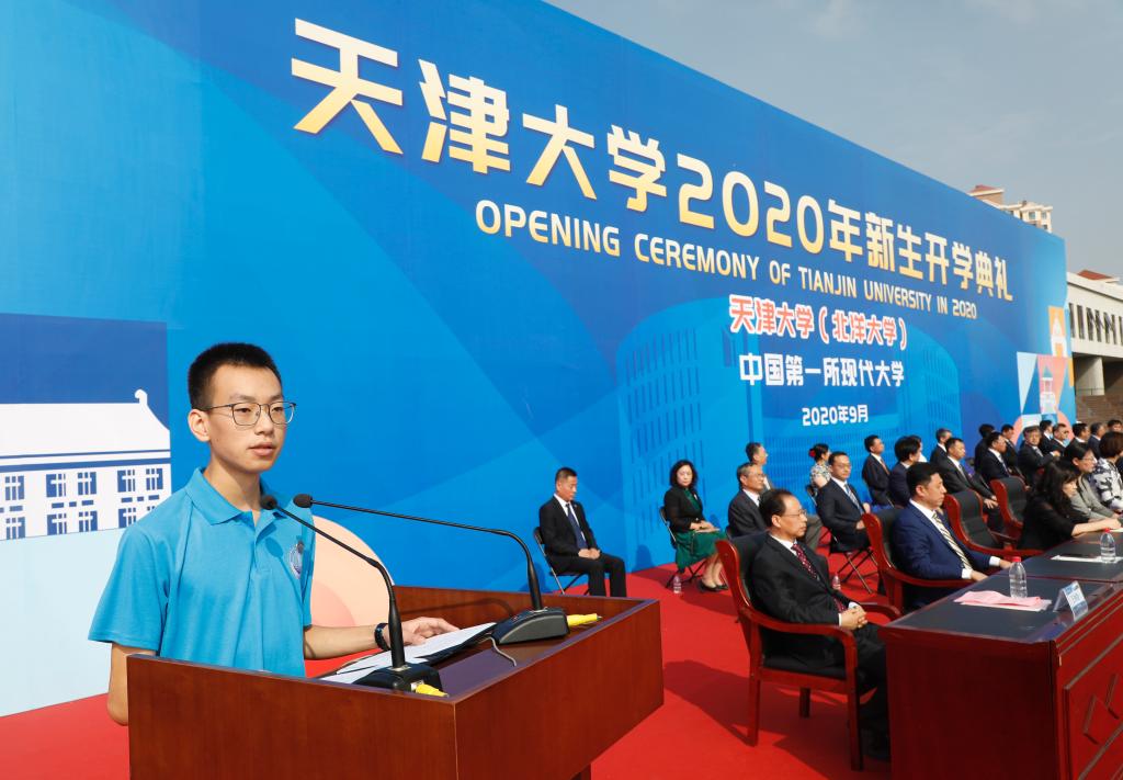 作为新生代表,化工学院化工能源与生命医药类2020级本科生谈家宁在典礼上讲述了自己与天津大学的“特殊情缘”。2013年起,天津大学定点扶贫陇南市宕昌县。“作为陇南人,我见证着家乡的点滴变化。一笔笔扶贫资金、一间间梦想教室、一场场云课堂、一面面文化墙、一项项扶贫产业项目落地、一批批天大教师接力帮扶,家乡的硬件设施上去了,文化软实力彰显了,父老乡亲的干劲更足了,孩子们的眼里有了光。”如今终于走进梦寐以求的北洋园,他决心“立天大志,成天大事”,为实现中国梦贡献天大力量。
