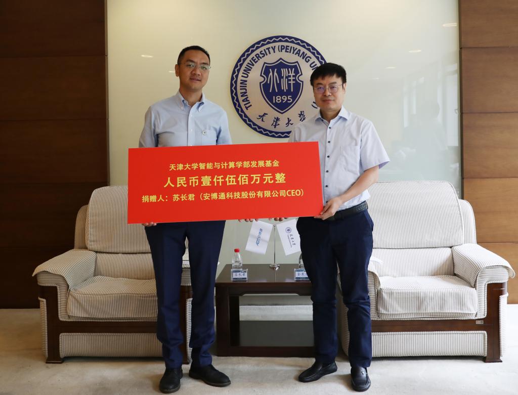 本站讯(供稿 基金会 摄影 唐蒙)8月26日上午,中国工程院院士、天津大学校长金东寒在卫津路校区会见安博通科技股份有限公司CE0苏长君校友一行并举行座谈。座谈会上,苏长君以个人名义捐赠1500万元设立“天津大学智能与计算学部发展基金”,与会双方还共同为“网络安全技术联合实验室”揭牌。科学技术发展研究院、校友与基金事务处、信息与网络中心、智能与计算学部等单位负责人参加座谈。