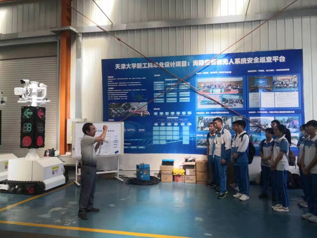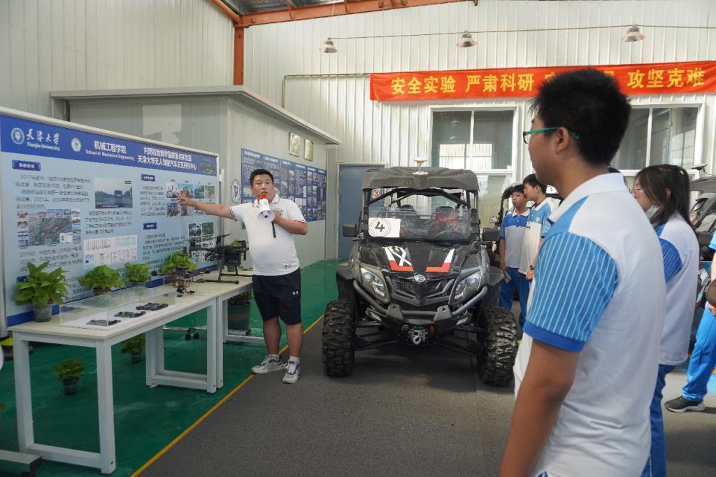 在智能汽车改造车间,谢辉老师作为“天津大学新工科海陆空智能无人安全巡查系统毕业设计”的项目带头人,向大家介绍了该系统的工作原理和项目目标。同时,谢老师为同学们科普了“新工科”的先进教育理念,鼓励大家好好学习,将来报考天津大学,成为天大校友。研一新生陈云同学,作为天津大学2023届本科生新工科海陆空智能无人安全巡查系统优秀毕业设计代表,向大家介绍了自己的研究内容和研究成果。闫龙博士向高中生们介绍了试验场的建设过程,布局规划和工作机制。