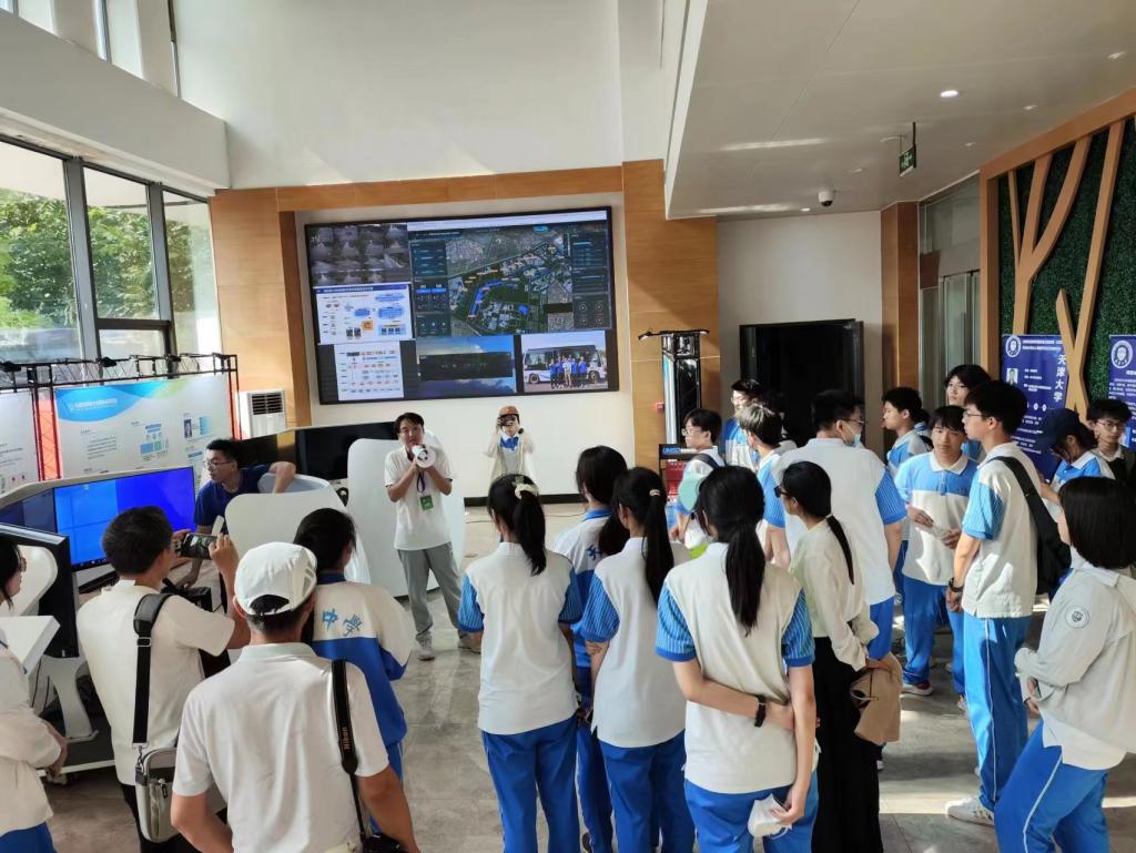 研二的李方轩同学和姜子涵同学为高中生们介绍海河教育园智能网联汽车开放测试道路上的智慧站点和智慧车站。智慧路口和智慧车站以路侧智算设备为核心,通过设备内置的算力,实现车路云协同智能感知和消息处理,实现了智能的交通治理服务,提升了智能路口的交通安全水平和管理效率。