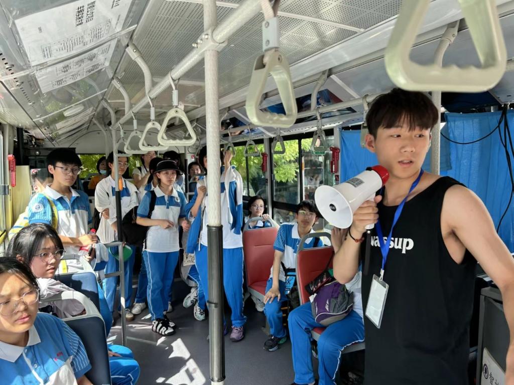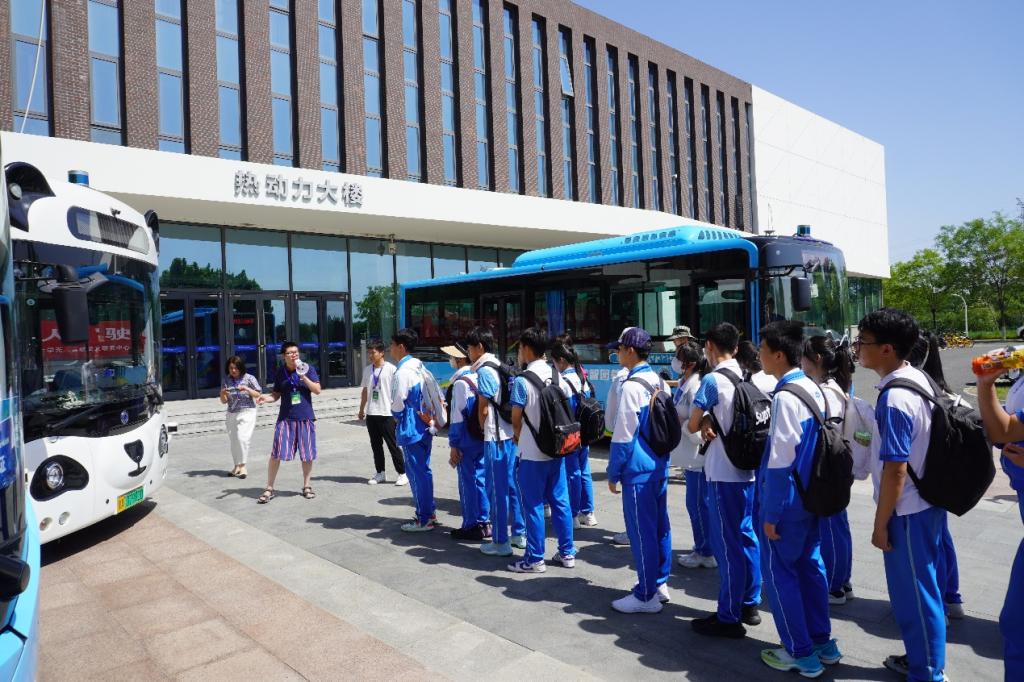 袁聿震博士在热动力大楼广场,给高一五班的同学介绍“熊猫”智能公交的相关知识。“熊猫”智能公交是具备智慧驾驶功能的纯电动公交,能够在预设线路的行驶过程中,通过对道路、信号灯等交通信息的感知识别,实现自动加减速、自动紧急制动、自主变道等智能驾驶功能。“熊猫”智能公交将作为“双智”应用场景的重要载体,在生态城智能网联开放测试道路开展运行测试,探索多场景融合应用。