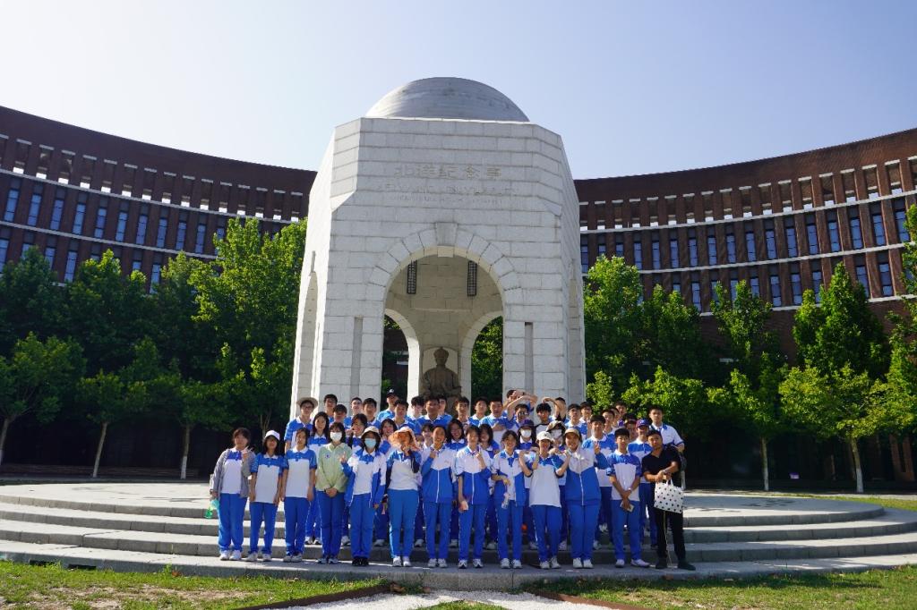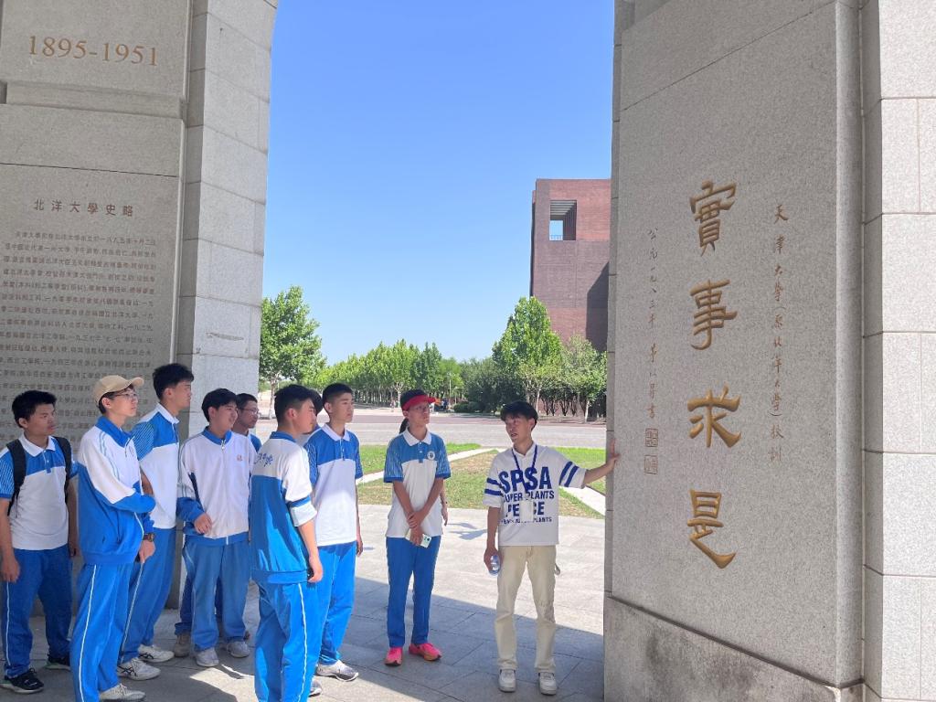 同学们在宣怀广场学习天大校史,聆听盛宣怀和天大的故事。盛宣怀是我国捐资创办大学的第一人,在他的整个办学理念中,都闪现着“经世致用”的光辉,他为北洋大学堂定下的校训就是“实事求是”沿用至今。韩笑同学作为天津大学2023年应届本科生,也是即将入学的研一新生,向同学们分享了自己对校训的理解和认识。